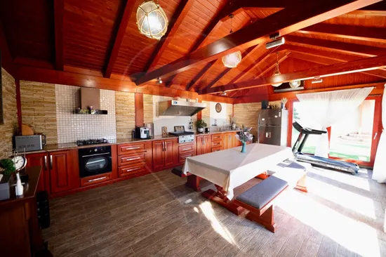 • o terasă spectaculoasă din lemn stratificat, complet echipată – aragaz, cuptor, grătar profesional din fontă, mașină de spălat vase și aer condiționat