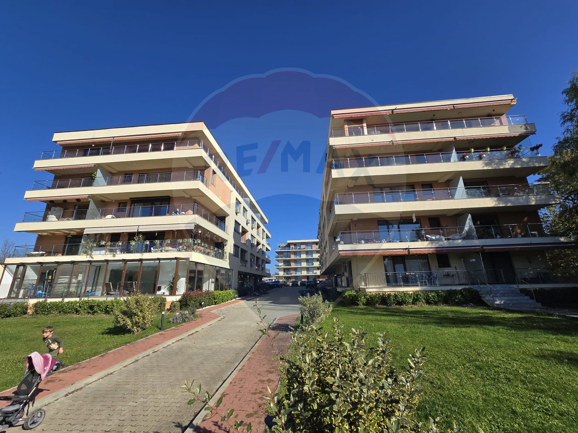 - Terase generoase pe ambele părți ale apartamentului, totalizând 20 mp, oferind vedere către zona interioară a complexului, dar și lateral spre lac