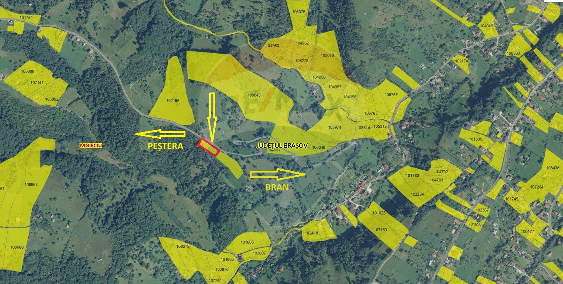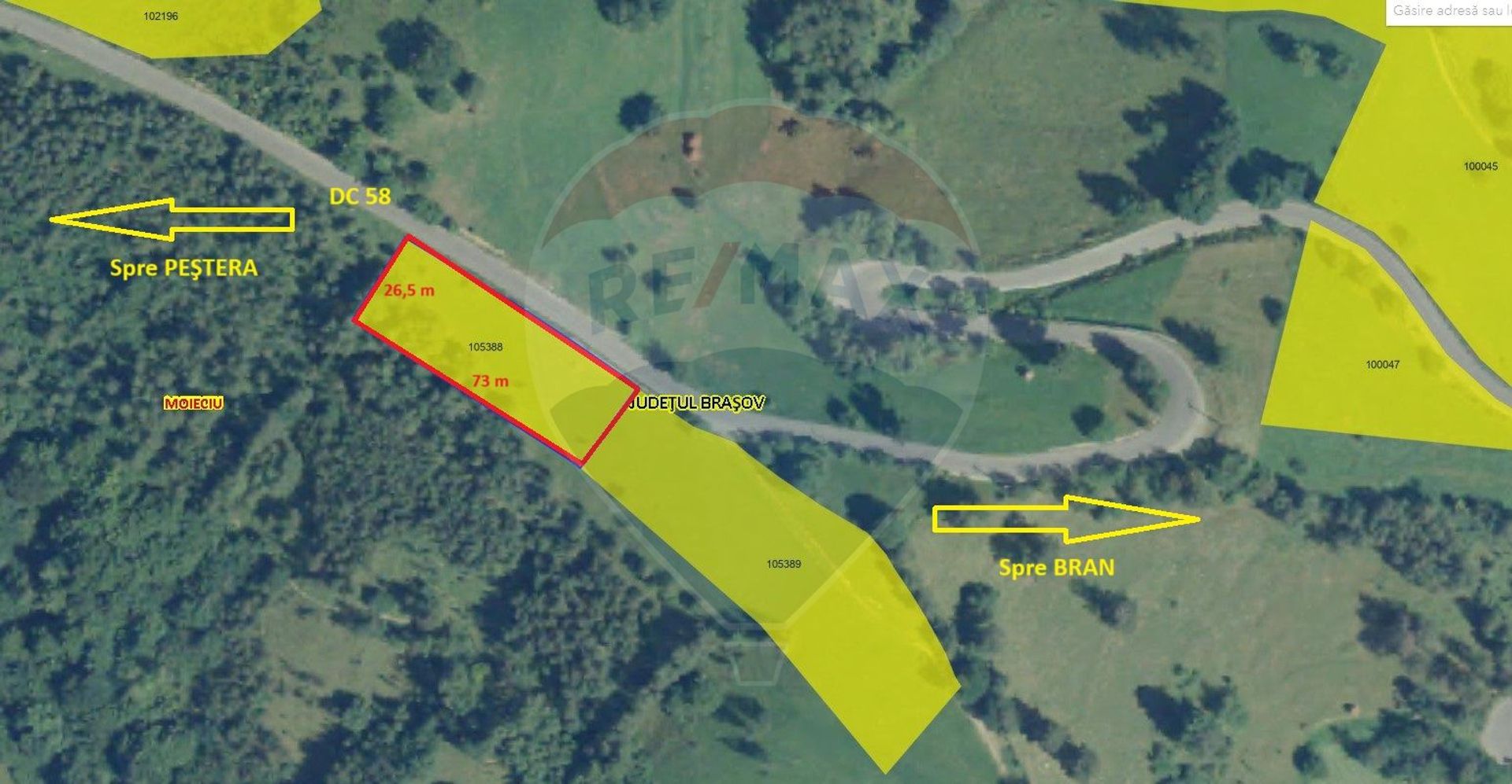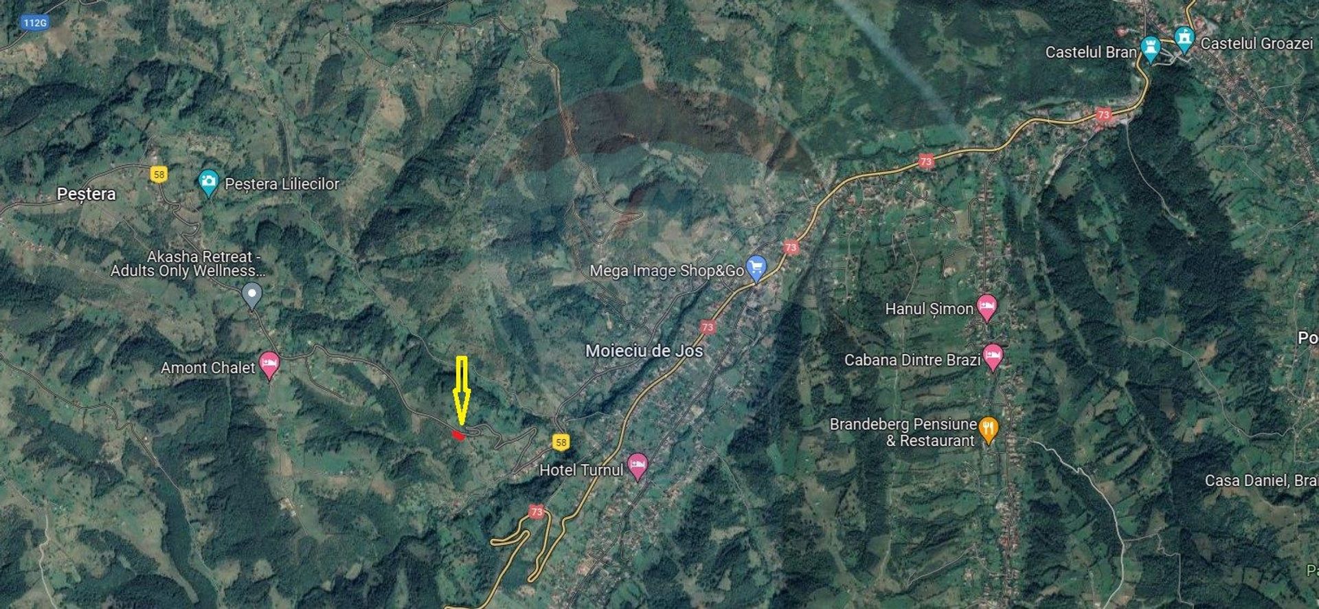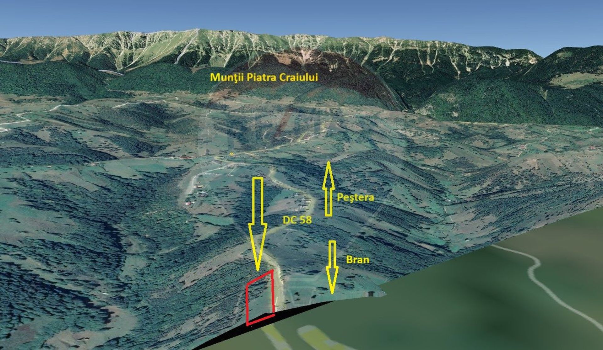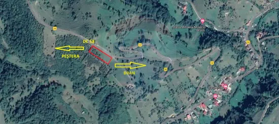 Teren extravilan, fâneață, neîmprejmuit, 2000 mp, situat în sat Peștera, com Moieciu, la 6 km de Castelul Bran și la 2 km de DN 73, cu o priveliște superbă spre Piatra Craiului şi Bucegi. Curentul este la teren. Accesul se face din DC 58, drum comunal asfaltat.