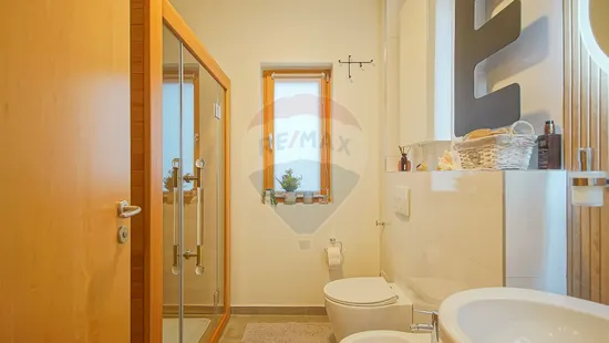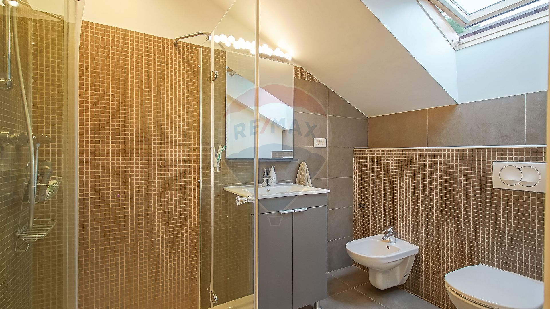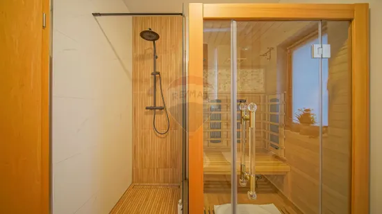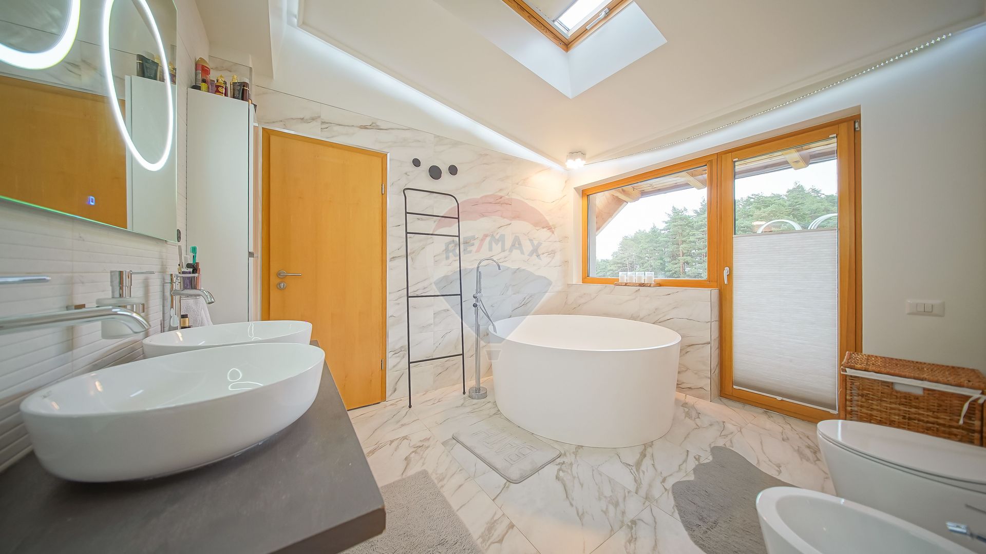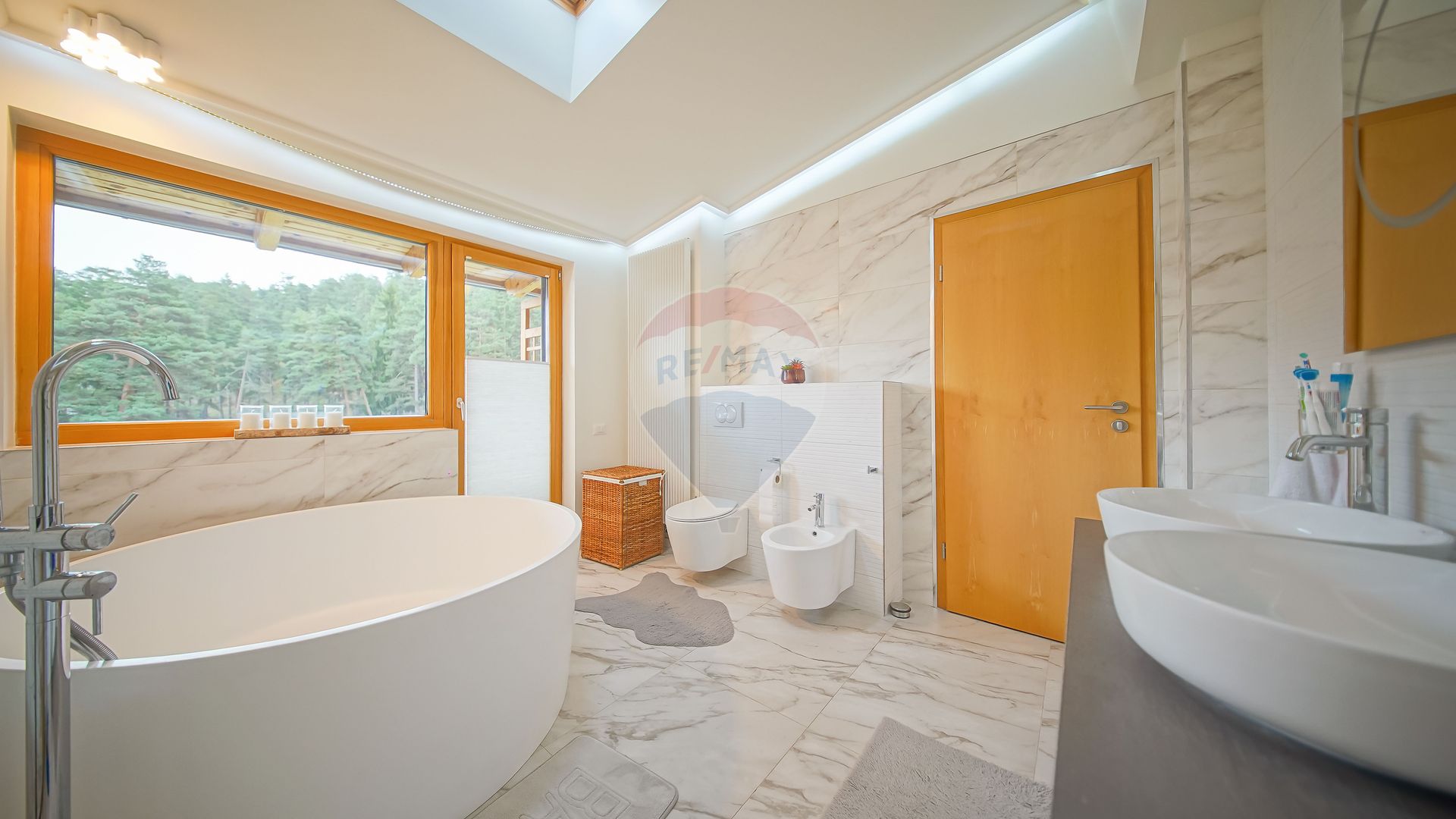 Dormitoarele sunt confortabile și orientate către verde, iar baia principală cu geam spre pădure creează una dintre cele mai frumoase experiențe de wellness de acasă.