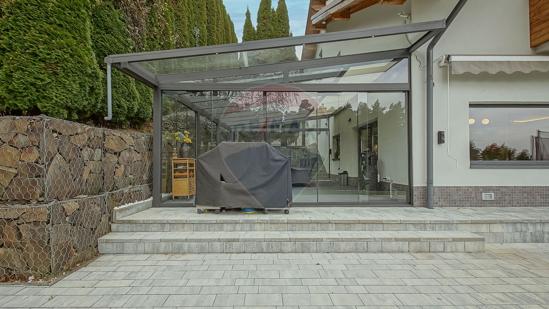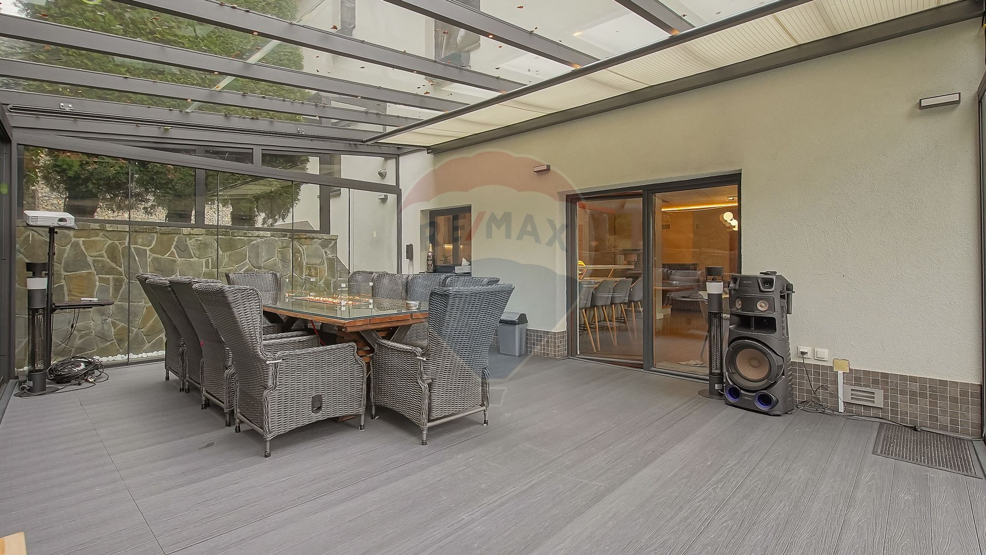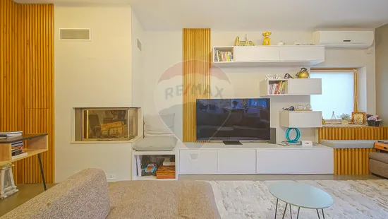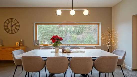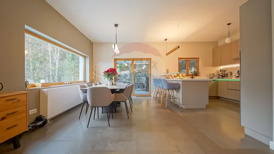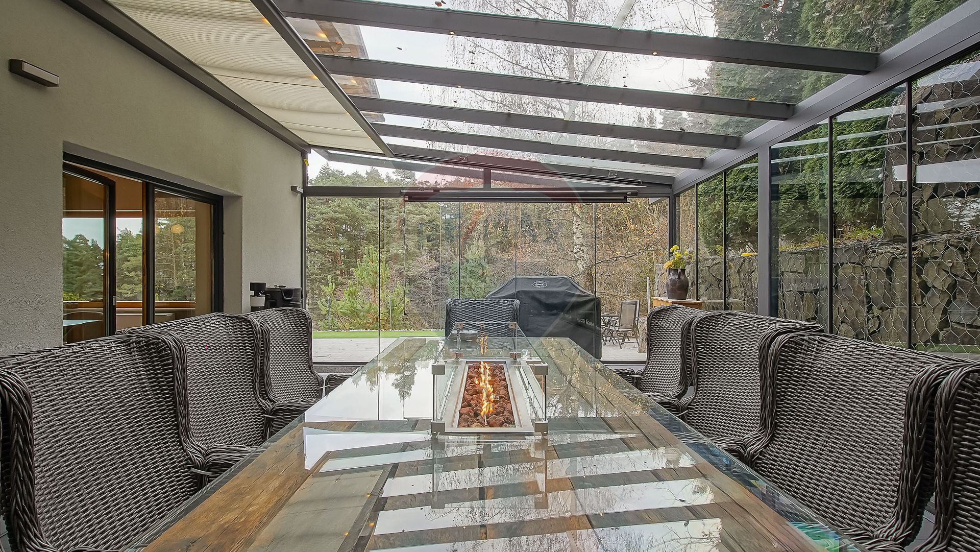 Zona de zi se continuă natural cu terasa exterioară din sticlă — un spațiu spectaculos, utilizabil tot timpul anului, dotat cu masă lungă cu foc (fire pit), ideală pentru seri cu prieteni sau momente de relaxare în liniștea naturii.