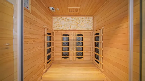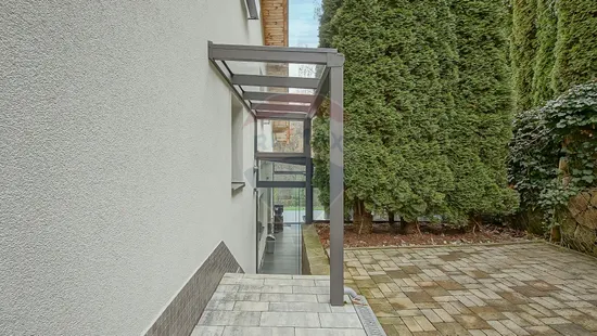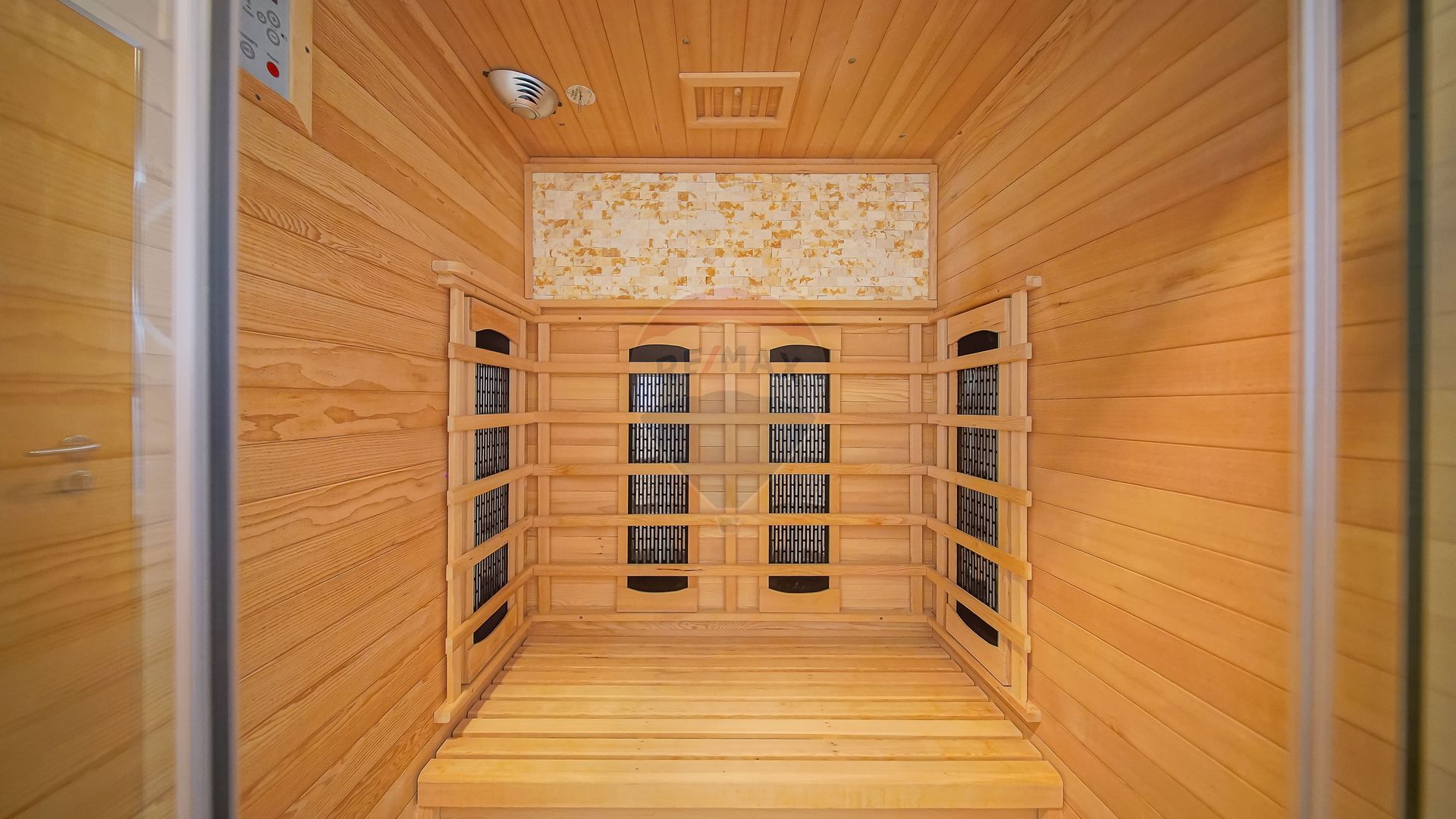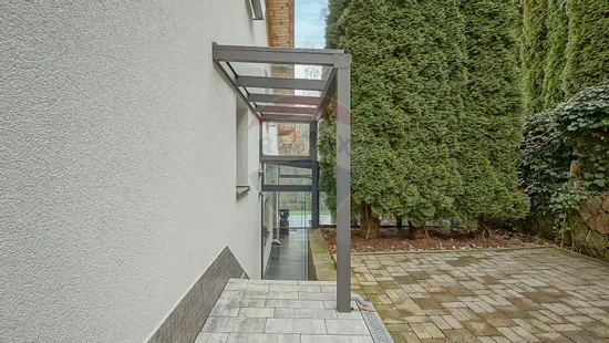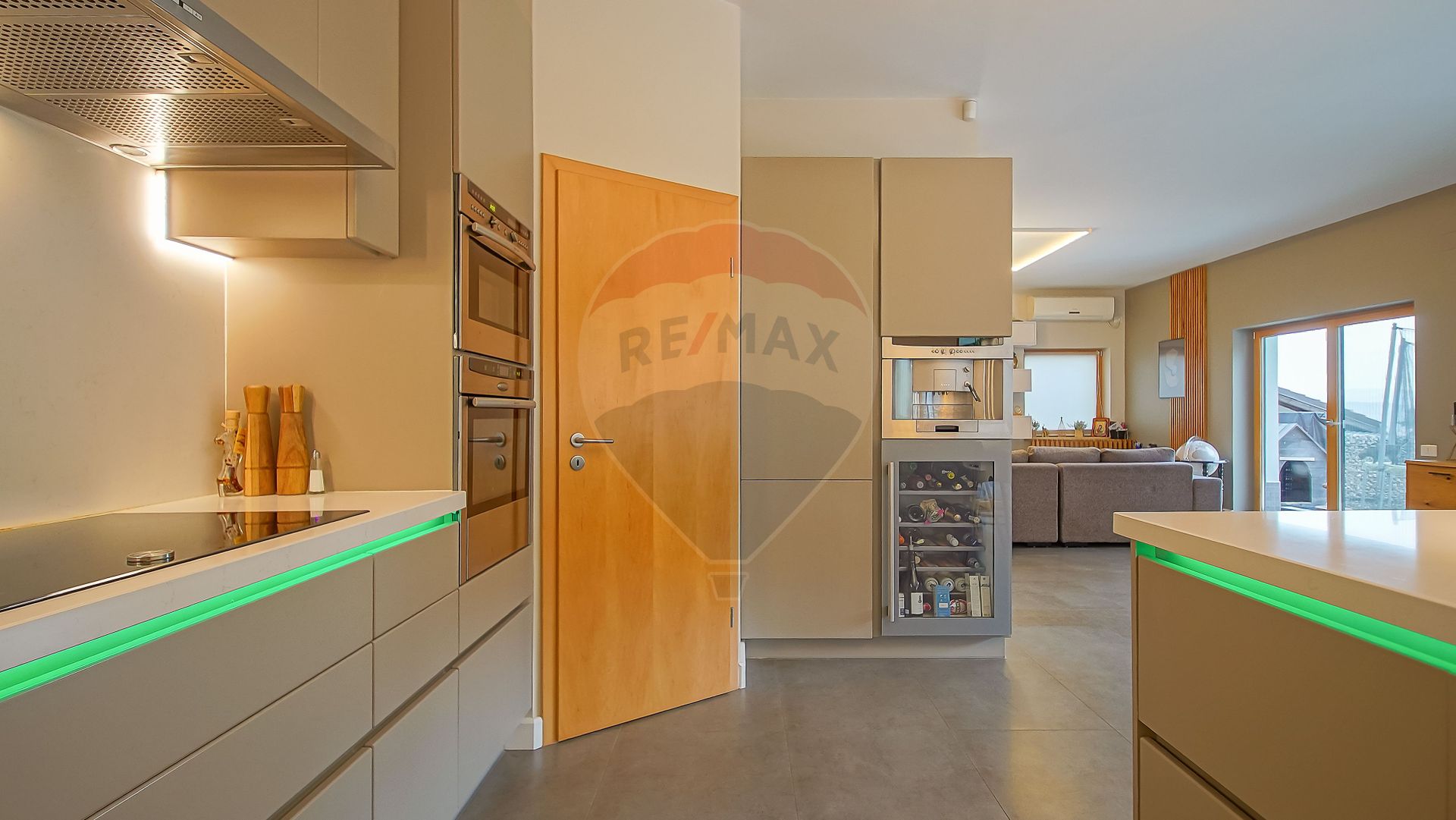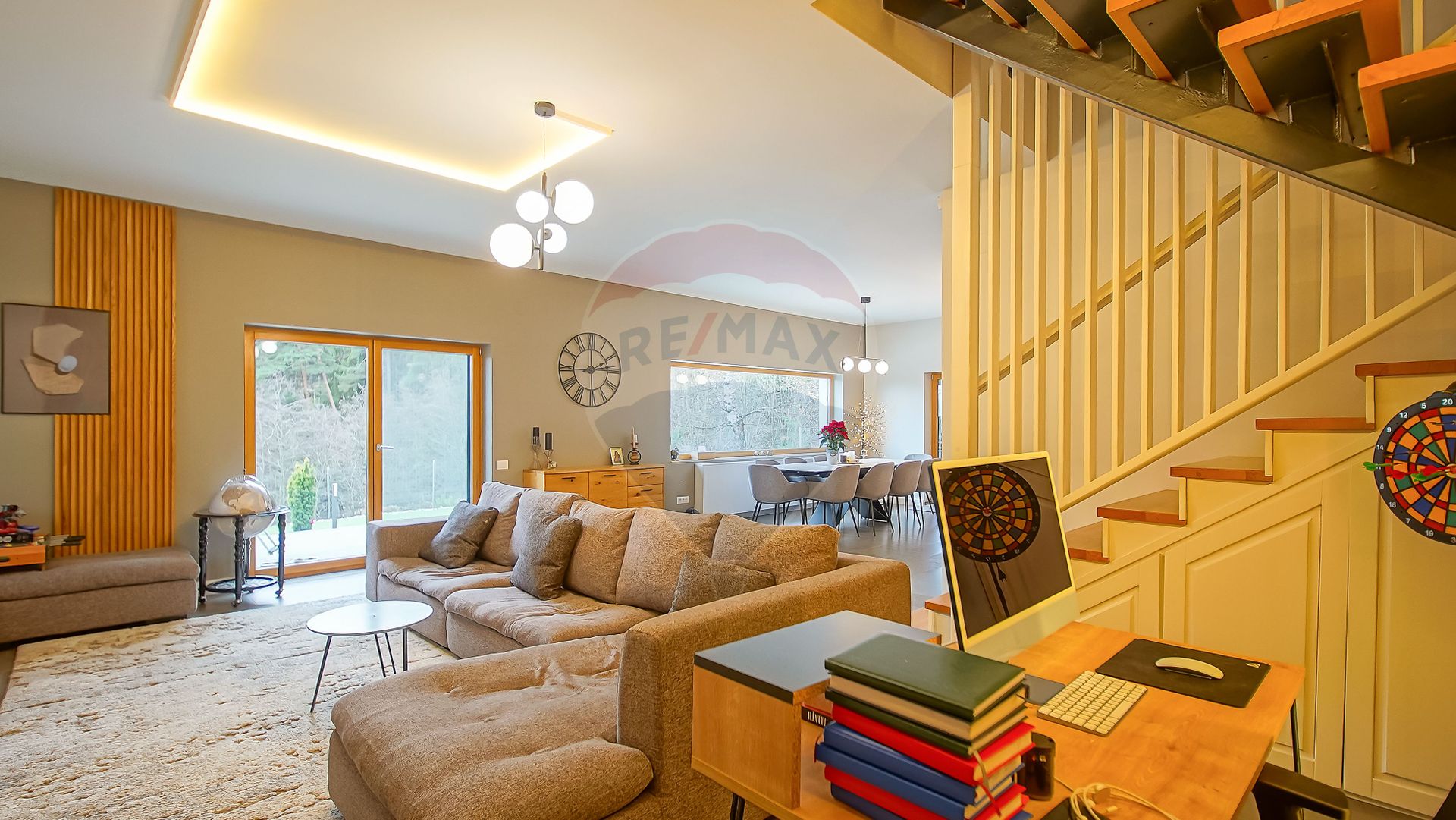 Zona de zi se continuă natural cu terasa exterioară din sticlă — un spațiu spectaculos, utilizabil tot timpul anului, dotat cu masă lungă cu foc (fire pit), ideală pentru seri cu prieteni sau momente de relaxare în liniștea naturii.