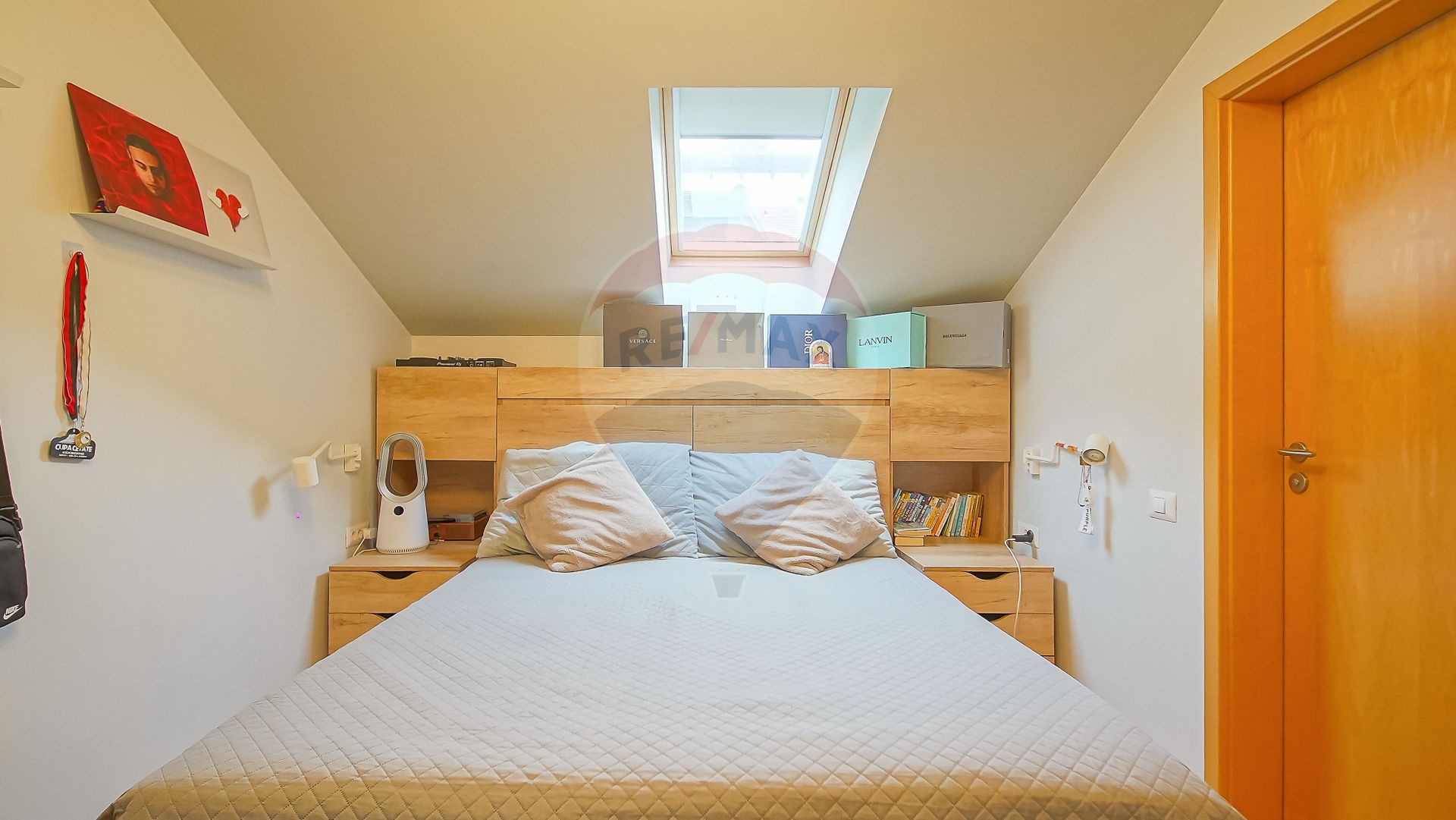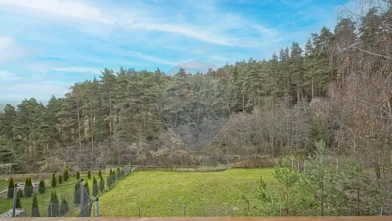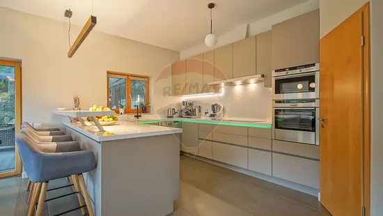 Casa este constituita din living generos cu bucatarie deschisa de 65 mp, 4 dormitoare, 4 bai, dintre care una cu geam panoramic spre padure, 2 terase de 32 si 98 mp, una din ele cu vedere panoramica si 2 balcoane. Interiorul casei este gândit modern, cu spații deschise, luminoase, ferestre largi și vedere permanentă spre pădure.