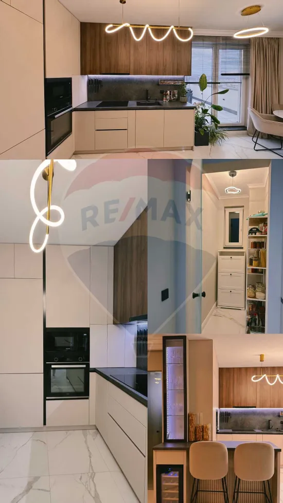 - Finisat cu atenție la detalii: baghete și tencuieli decorative, vopsele premium Caparol, Iluminat LED dimabil (nuanțe și intensități) cu telecomandă peste tot, întrerupătoare touchscreen de sticlă, prize de sticlă;