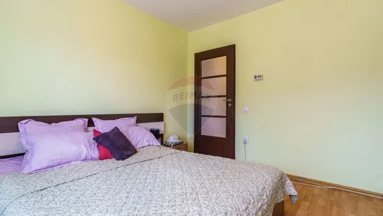 Dormitorul oferă un spațiu luminos și primitor, fiind dotat cu un dulap mare cu uși glisante și oglinzi, care maximizează depozitarea și creează un efect vizual de mărire a spațiului.