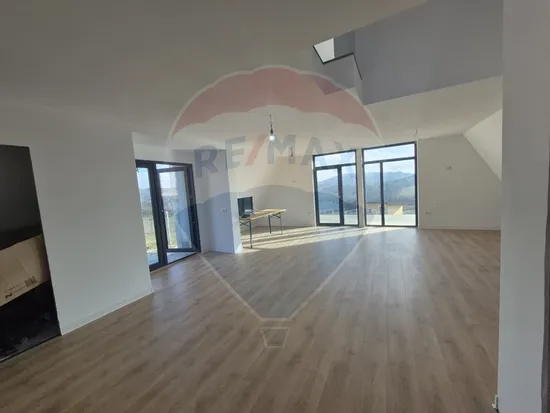 Compartimentare parter: hol, bucatarie deschisa, baie pentru oaspeti, logie si zona larga de livin cu acces direct catre terasa de 26 mp cu vedere panoramica