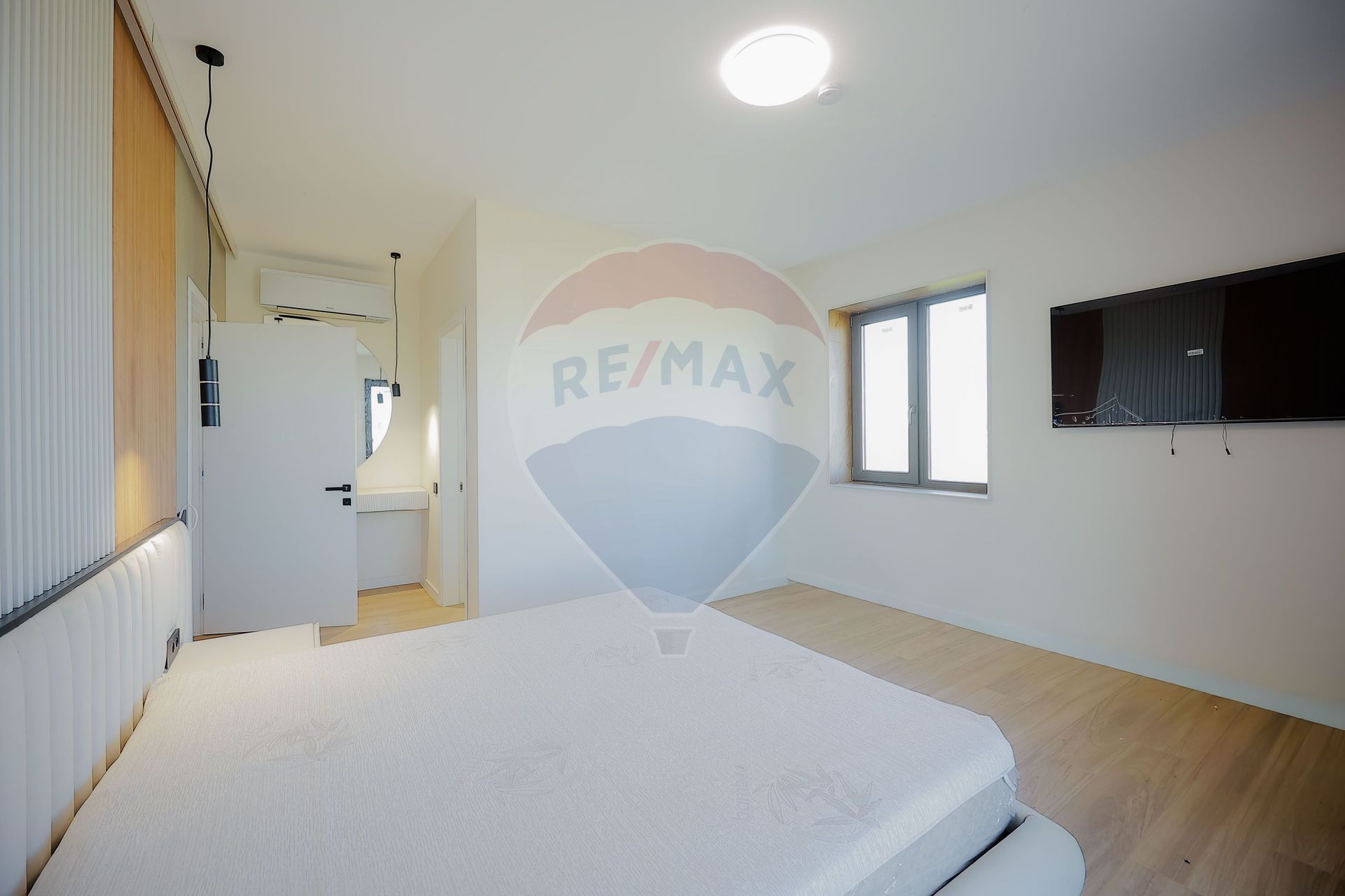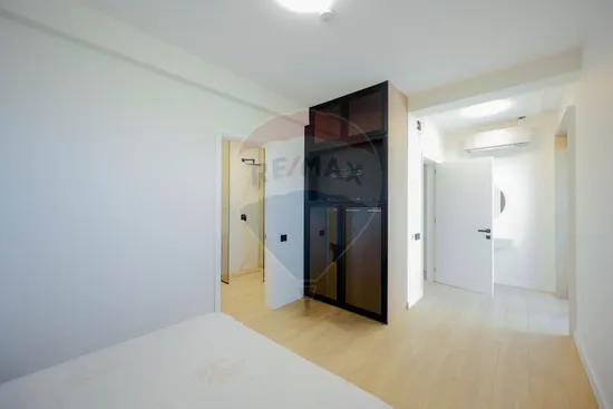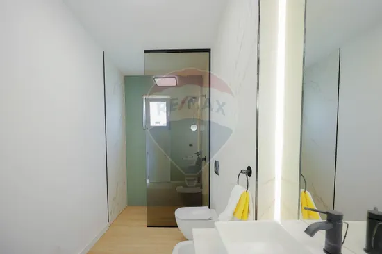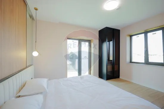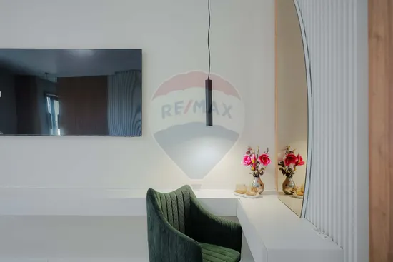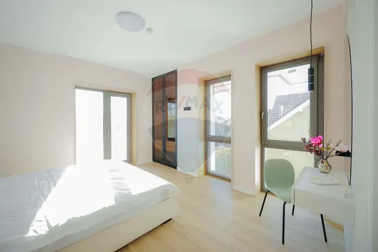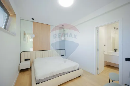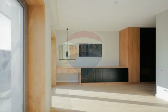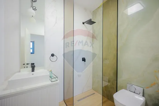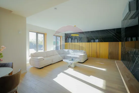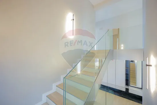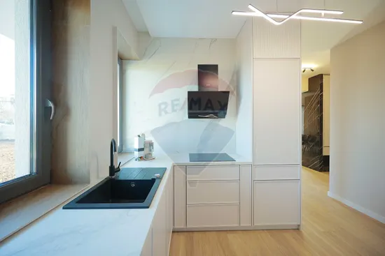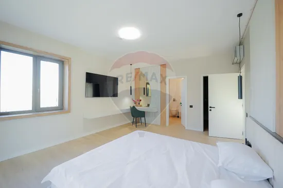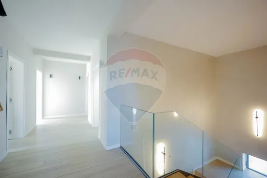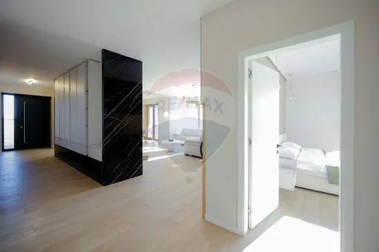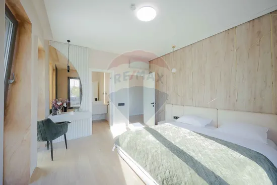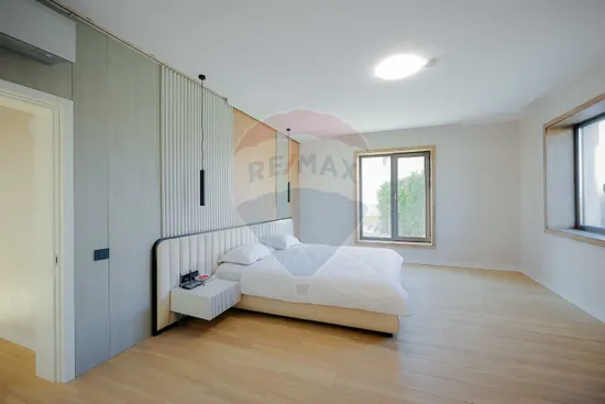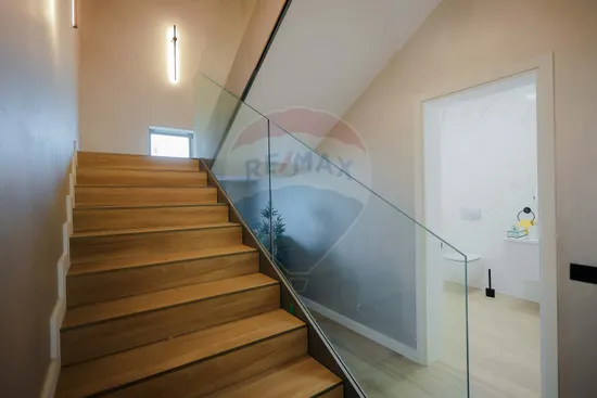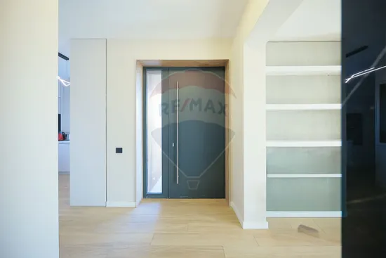 Interiorul impresionează prin finisaje premium și elemente realizate special: ușile din lemn masiv executate la comandă, mobilierul din lemn cu iluminare LED activată la deschidere, riflajele interioare din lemn masiv cu LED încorporat, paturile din camere tapițate integral, cu sistem LED personalizat, toate acestea contribuind la unicitatea locuinței. Băile sunt echipate cu instalații sanitare Ideal Standard, iar mobilierul lor, realizat custom made din MDF cu blat ceramic, se potrivește perfect cu gresia și faianța Marazzi folosită.