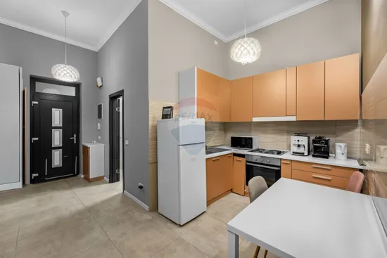 bucatarie separata cu loc de luat masa- complet utilata: frigider, microunde, cuptor incorporat cu plita.