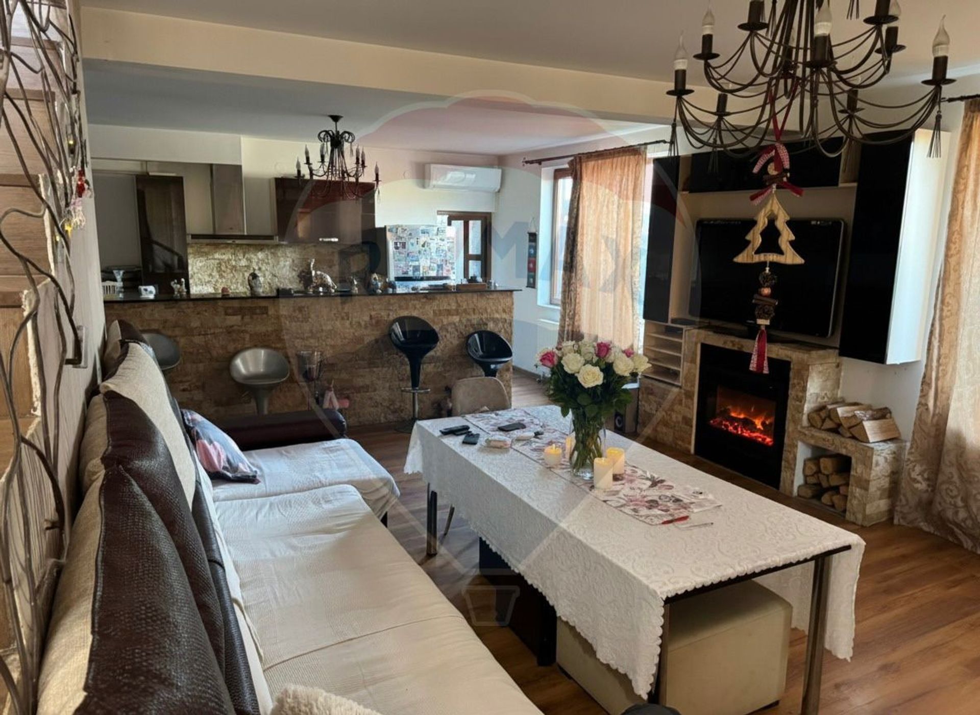 Dotări: Aer condiționat, Aragaz, Frigider, Mașină de spălat rufe, Mașină de spălat vase, Scară interioară, Șemineu, TV