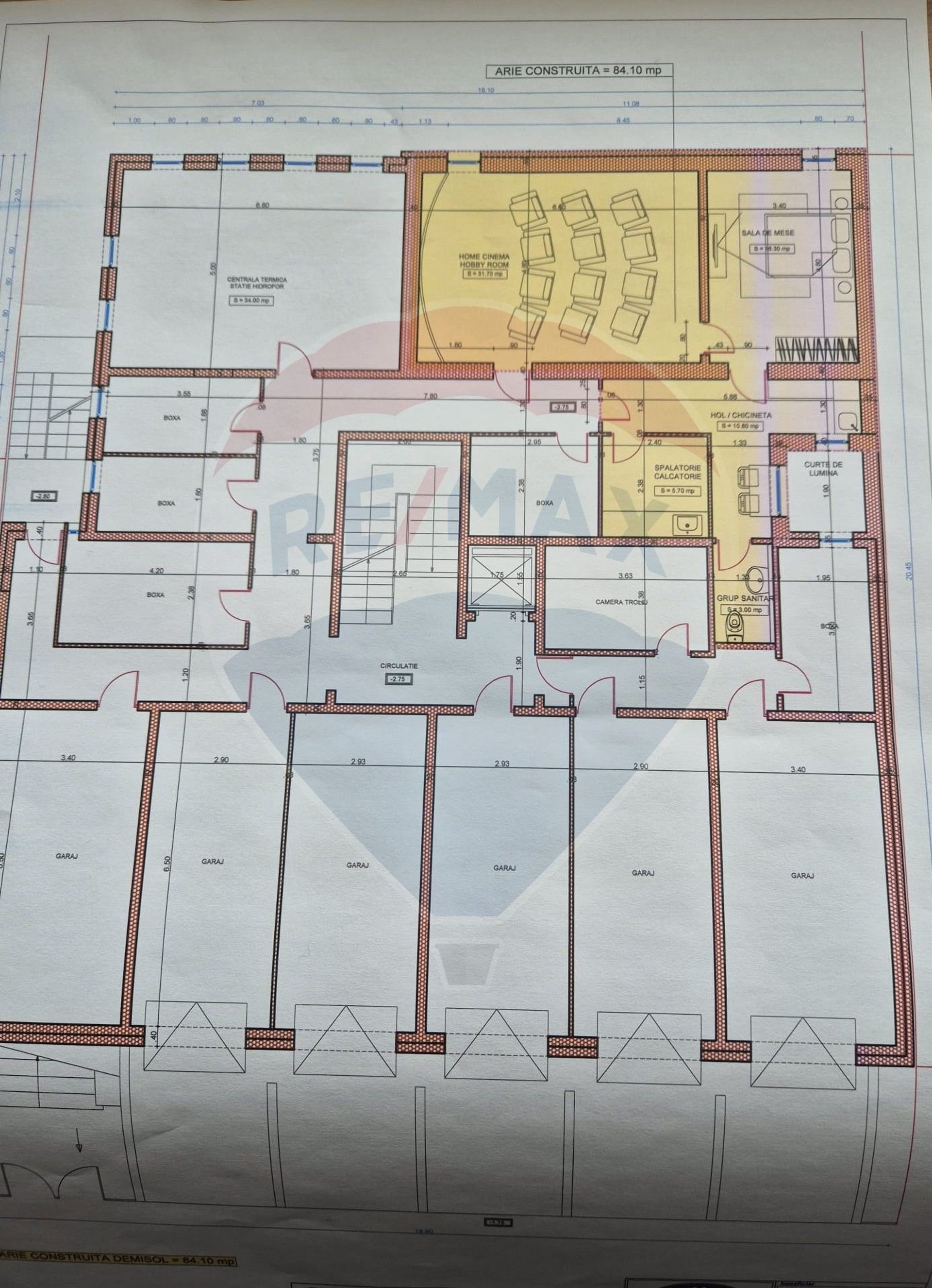 • Demisolul beneficiază de grup social, utilități pentru bucătărie și spațiu ce poate fi amenajat ca sală de mese.