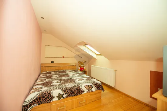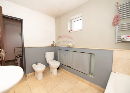 Casa impresionează prin finisaje premium și compartimentare inteligentă. Construcția beneficiază de izolație termică exterioară din polistiren expandat de 10 cm, iar la interior pereții sunt placați cu rigips verde și izolați cu vată minerală de 10–15 cm.