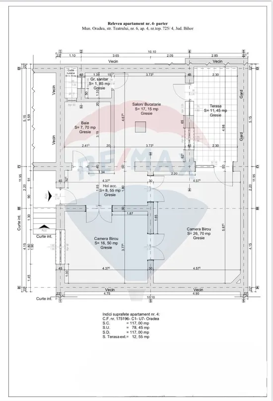 Proprietatea a fost renovată complet în 2023 și este funcțională integral. Are o suprafață utilă de 78,45 mp, este amplasată la parter și este compartimentată în două birouri bine proporționate, două băi, bucătărie și hol de acces. În completare, există o terasă privată de 12,55 mp, precum și două boxe la subsol. Spațiul se vinde în forma actuală, conform imaginilor, fără a fi necesare lucrări suplimentare sau investiții ulterioare.