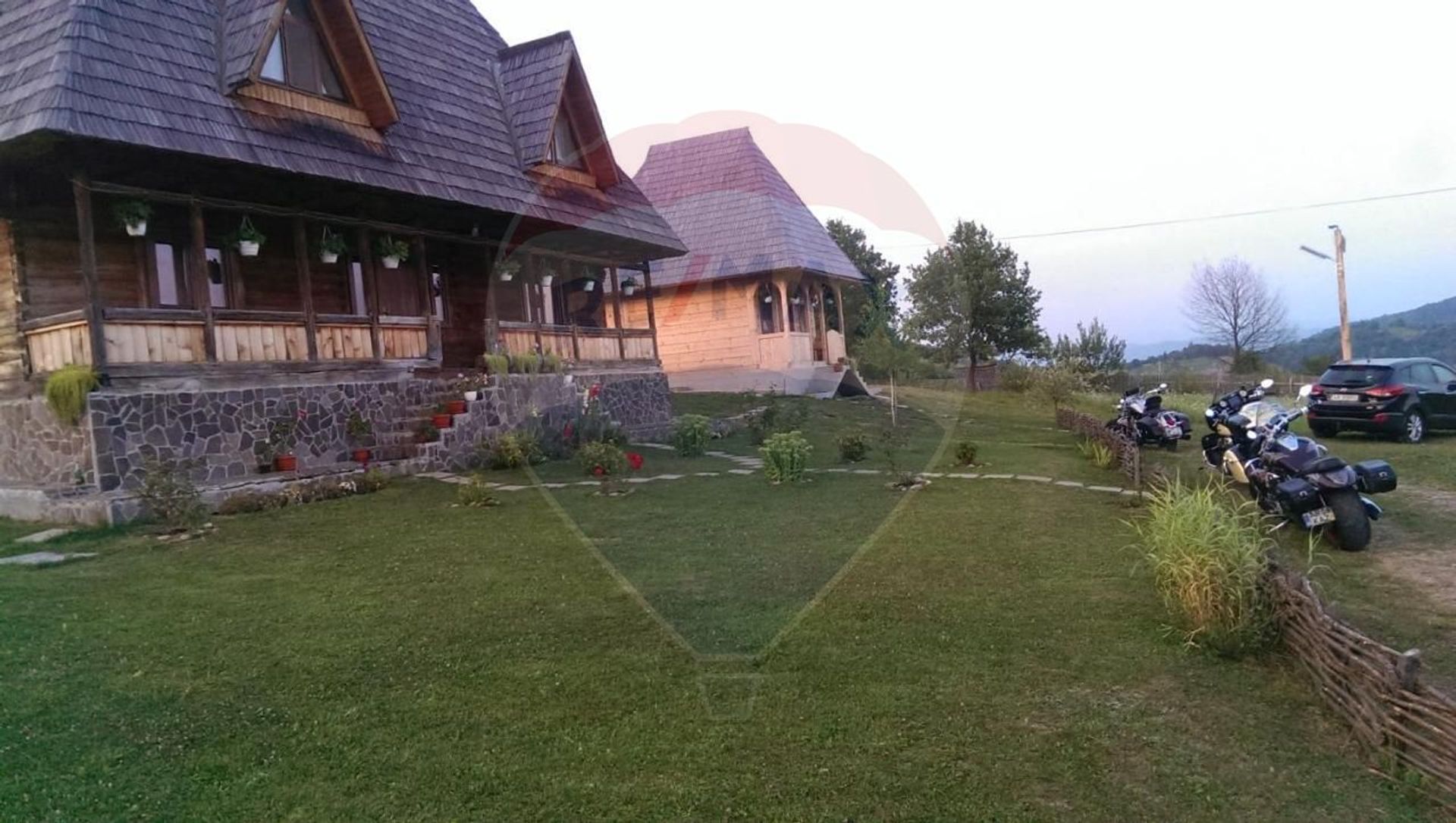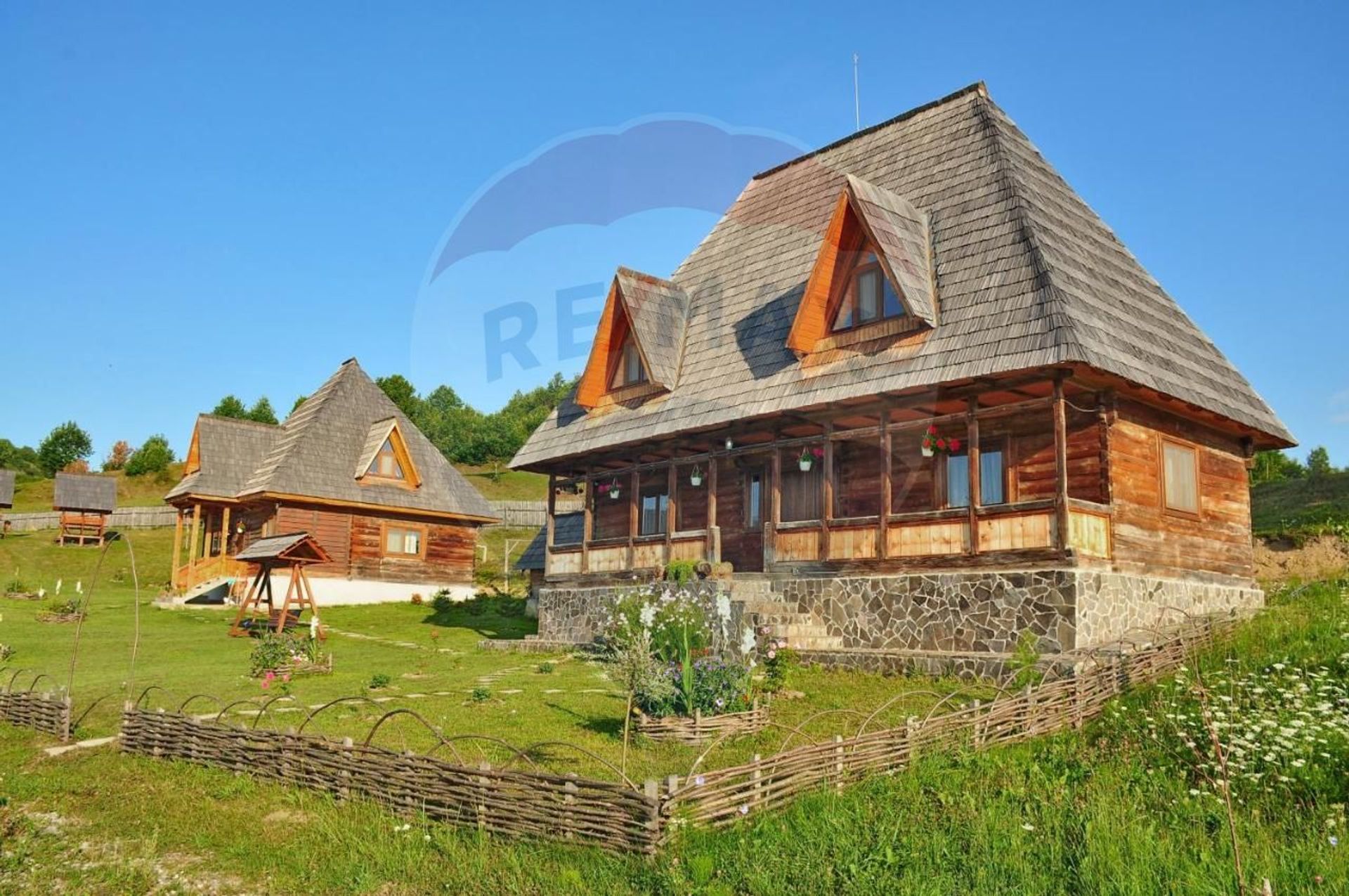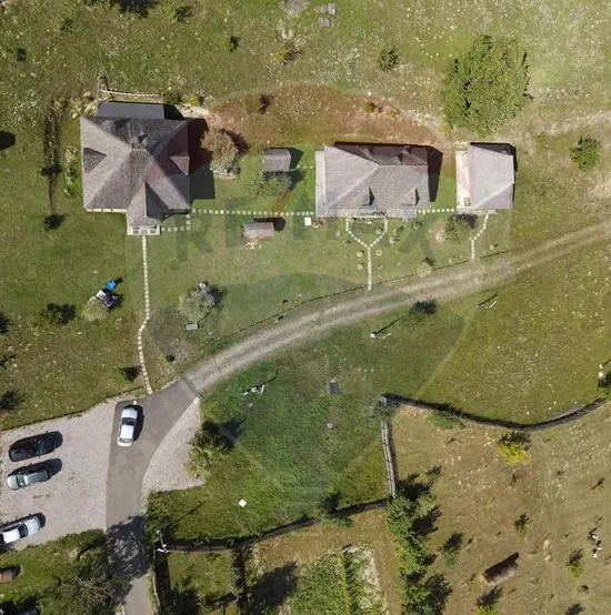 Proprietatea se intinde pe o suprafata de 15750 mp, pe care sunt construite trei case in stilul maramuresan: