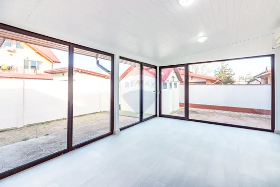 -parter: hol de acces, bucatarie inchisa, living + zona de dinning, dormitor, baie, camera tehnica. Din bucatarie se iese pe terasa de 20 mp inchisa cu geamuri din sticla. Pentru familiile care au bona sau care au nevoie de un spatiu ce confera intimitate, dar care comunica cu restul casei, aflati ca parterul are si un separeu format din baie si o camera care poate fi dormitor, birou sau chiar bucatarie de vara; accesul in acest separeu se poate face si din terasa si din curte, intrare separata.