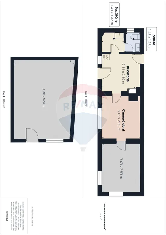 Corpul principal are 61,5 mp. Compartimentare eficientă: 3 camere, bucătărie, grup sanitar