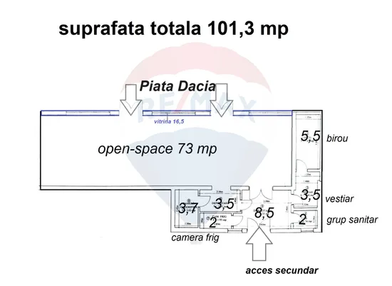 · Suprafață Totală: 101,3 mp, compartimentați funcțional pentru eficiență operațională.