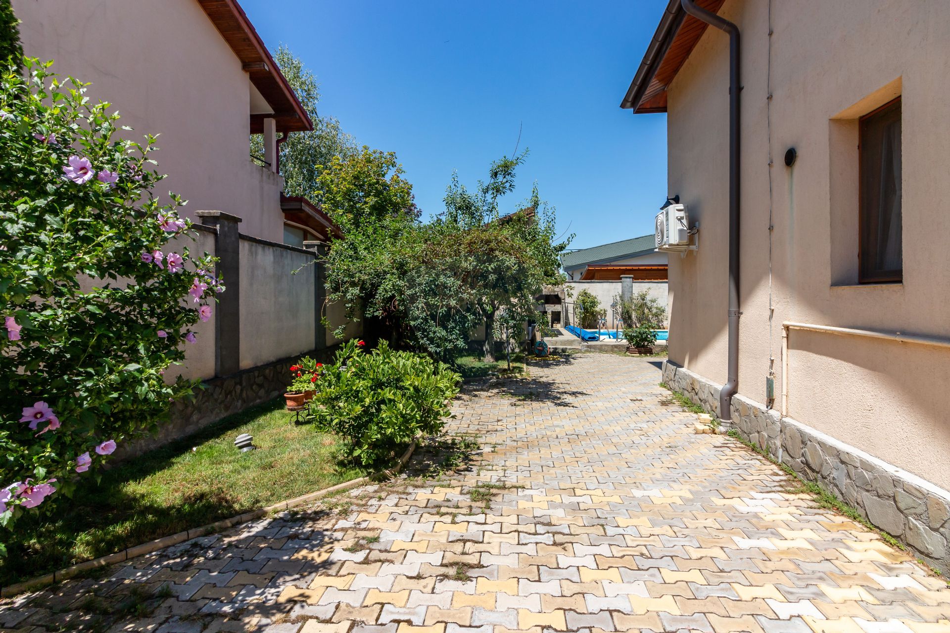 Explorati spatiile exterioare cu gradini bine ingrijite, sistem de irigatii, piscina, panouri fotovoltaice, terasa generoasa si multa liniste.
