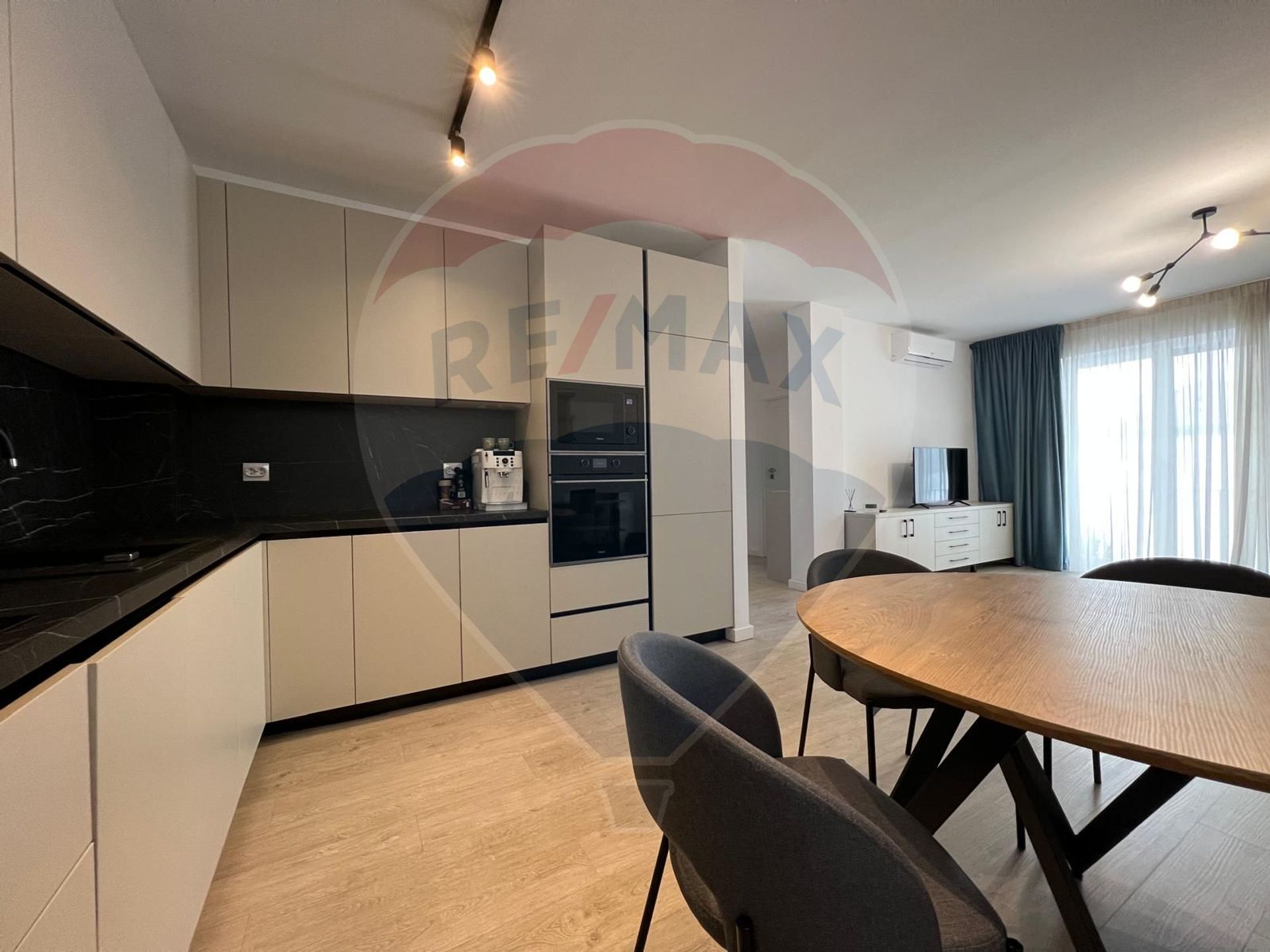 Mobilier & dotări lux, bucătărie cu electrocasnice high-end incorporate, dormitor spațios si baie elegantă și funcțională.
