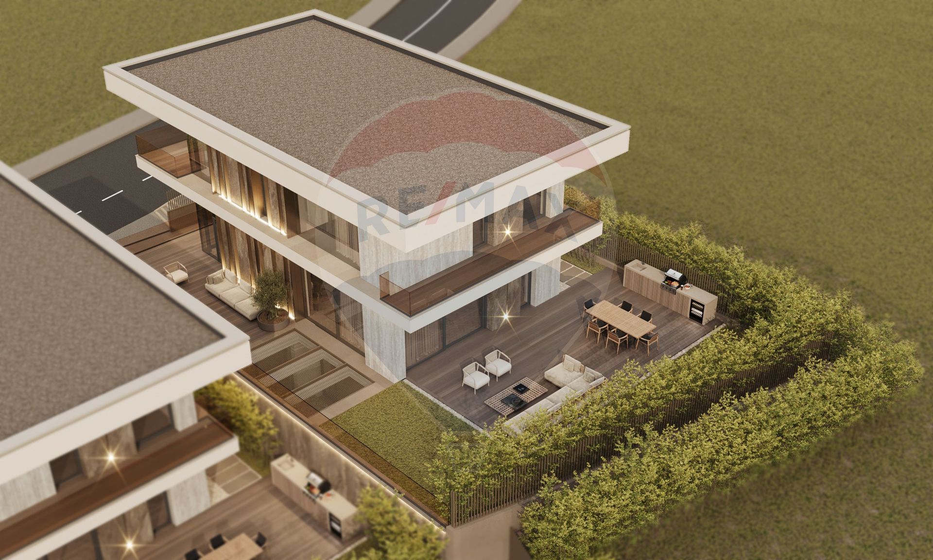 Parterul găzduiește zona de zi, cu hol de acces, baie, living luminos, bucătărie și două terase generoase: terasa aferentă livingului, de 34 mp, și terasa către curte, de 64 mp. Suprafața utilă a parterului este de 85 mp.