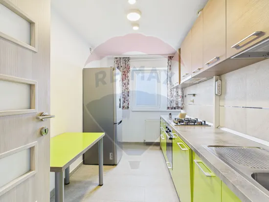 Bucataria este dotata cu frigider Samsung, masina de spalat vase Whirlpool si centrala termica.