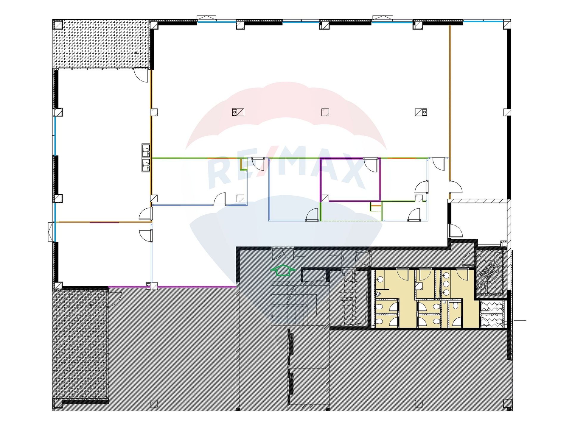 Spatiul oferit spre inchiriere este desfasurat pe un etaj intreg in suprafata de 1300 mp, fiind amenajat si functional pentru o singura companie IT dar se preteaza la a se imparti si in 2 spatii de proximativ 550-650 mp fiecare, cu acces diferit.