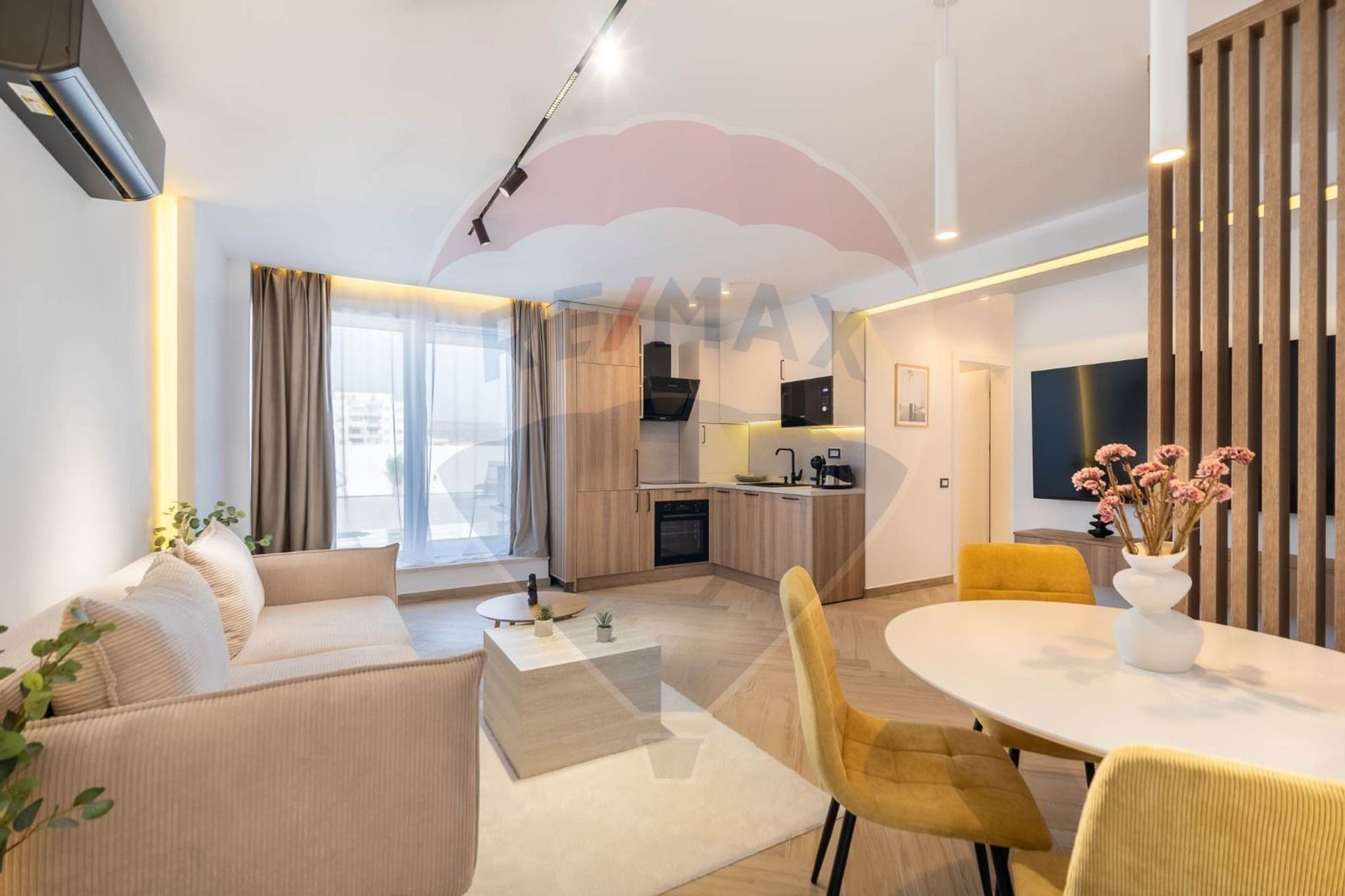 Locuința este compartimentată modern, având un living generos open space cu bucătăria, amenajată complet și dotată cu toate electrocasnicele necesare, inclusiv mașină de spălat vase. Zona de zi este luminoasă, gândită ca spațiu de relaxare și socializare.