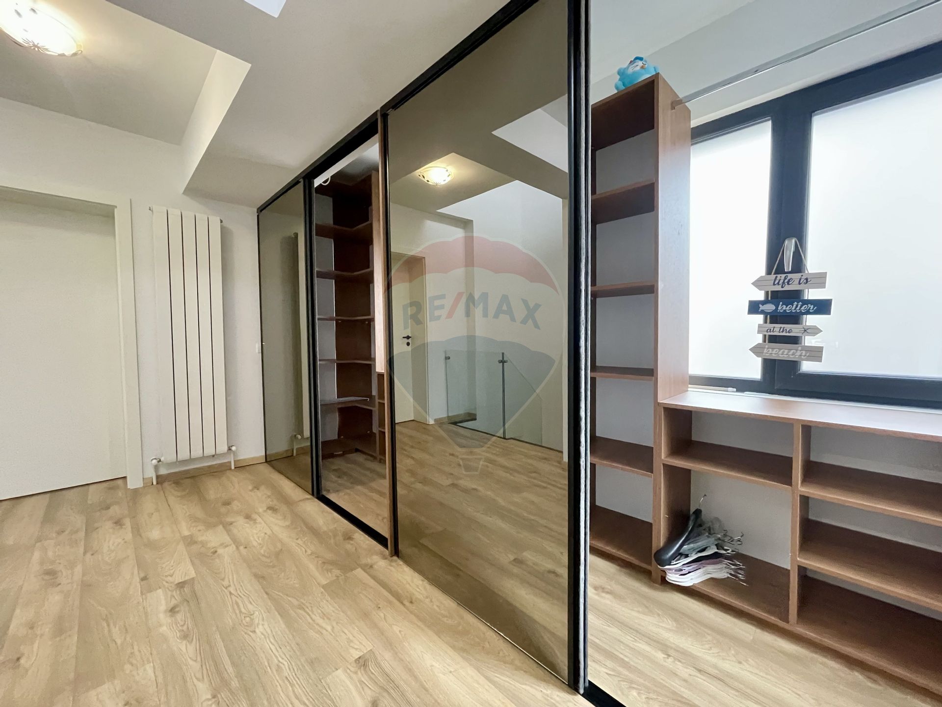 Compartimentarea include 3 camere (două dormitoare și un living), bucătărie complet mobilată și utilată, precum și două grupuri sanitare. Oferind spații ample de depozitare, locuința dispune și de un dressing generos pe toată lungimea holului de la etaj.