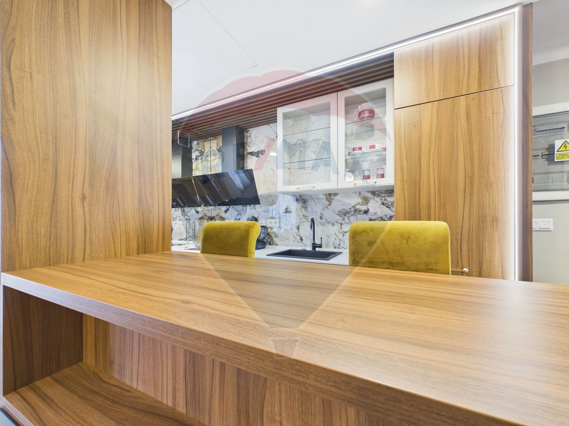 - Bucataria moderna, deschisa, echipata cu aparatura de ultima generatie si lumini dimabile. Va permite sa creati ambianta perfecta pentru fiecare masa.