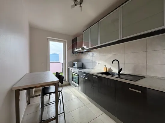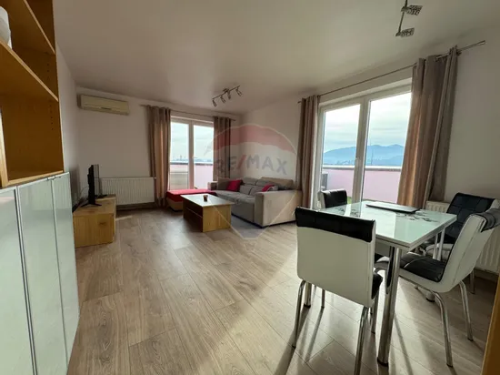 Penthouse de închiriat, situat la ultimul etaj al unui imobil modern, cu terasă generoasă și vedere panoramică spre munte. Apartamentul are o suprafață utilă de 55 mp, la care se adaugă o terasă spațioasă de 29 mp. Este proaspăt renovat și oferă un spațiu luminos, bine compartimentat, ideal pentru un cuplu sau o persoană care își dorește confort și intimitate.