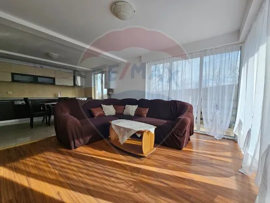 Un living generos cu bucătărie open-space, echipat cu plită, cuptor nou și mașină de spălat vase (pentru că timpul tău e mai prețios decât spălatul farfuriilor).