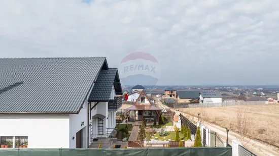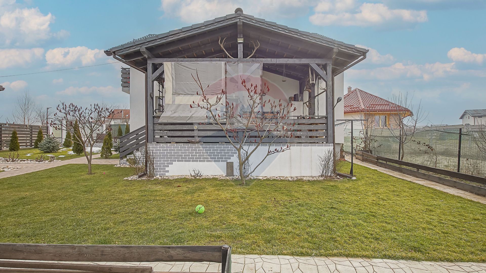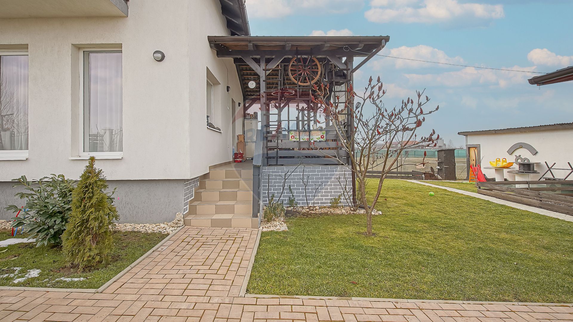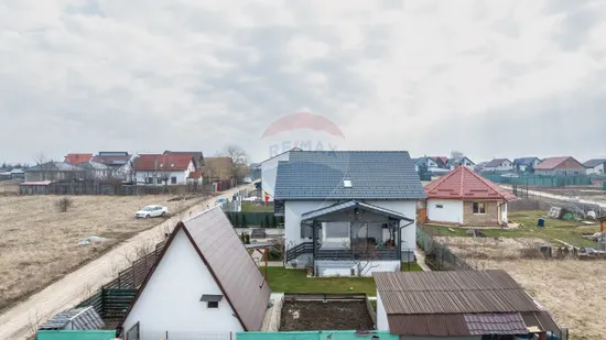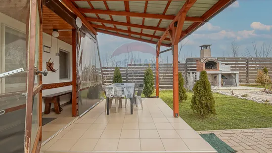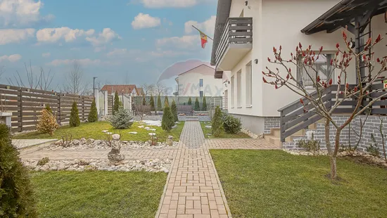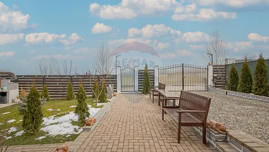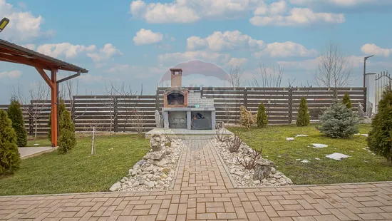 Suprafață totală a terenului este de 650 mp. Curtea este complet amenajată, cu gazon, pomi fructiferi, arbuști ornamentali și spațiu verde îngrijit.
