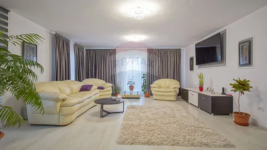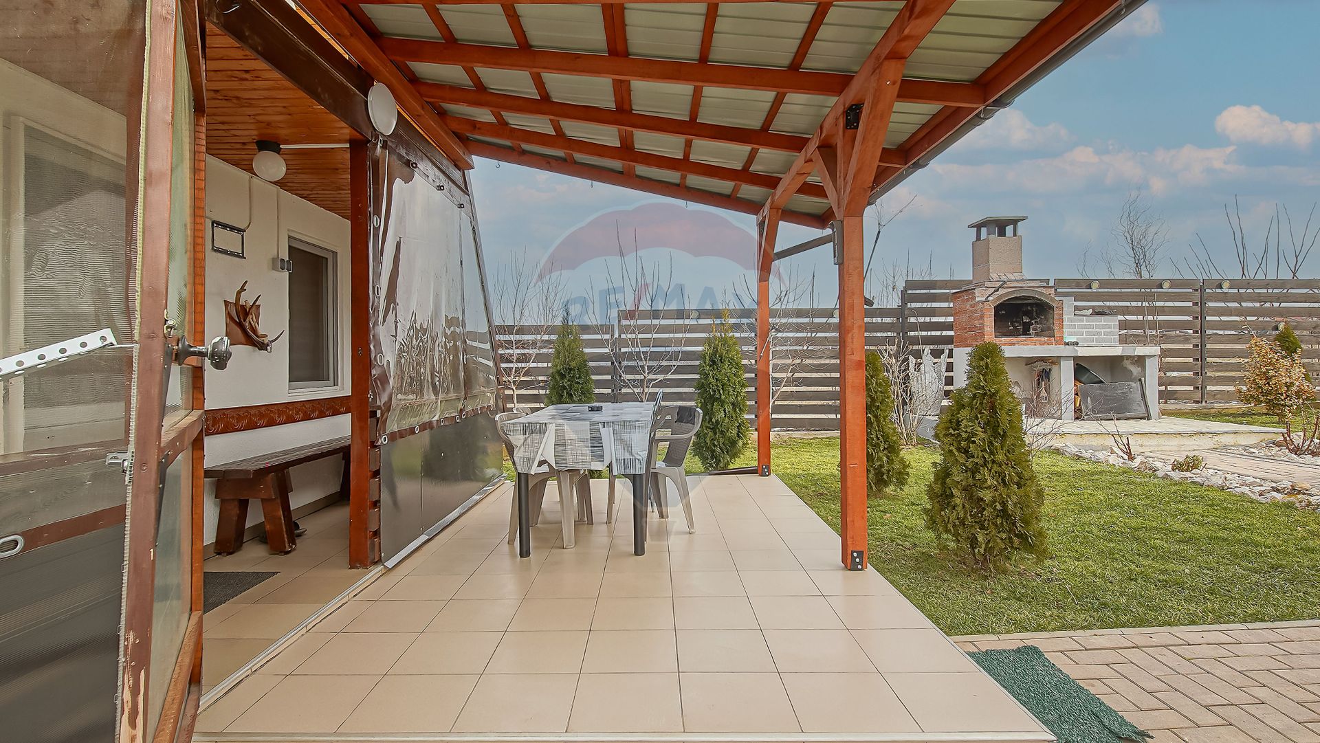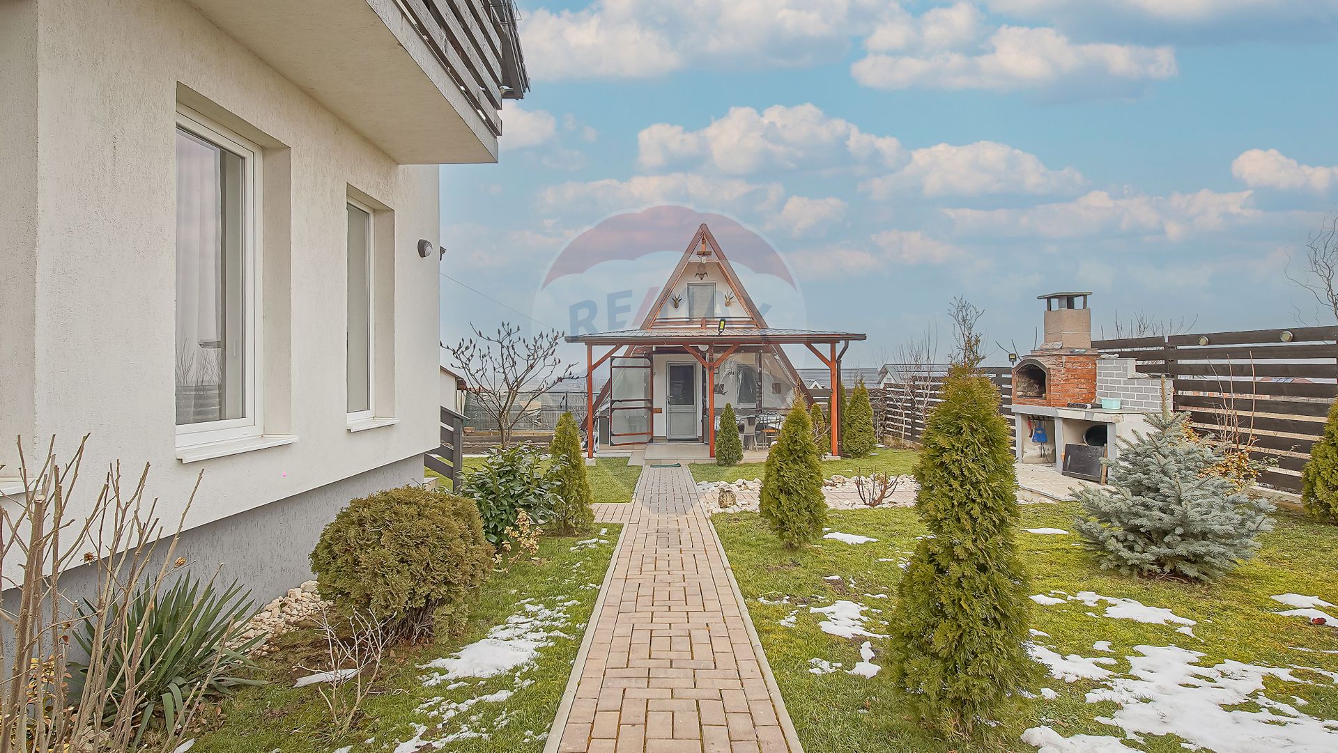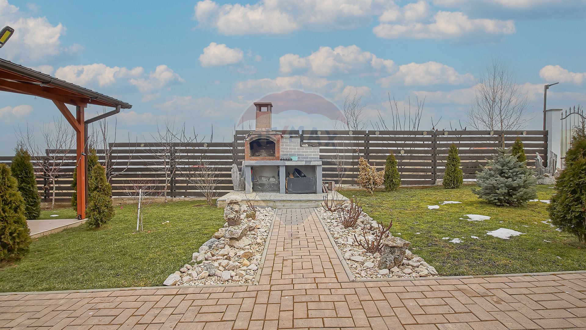 Suprafață totală a terenului este de 650 mp. Curtea este complet amenajată, cu gazon, pomi fructiferi, arbuști ornamentali și spațiu verde îngrijit.
