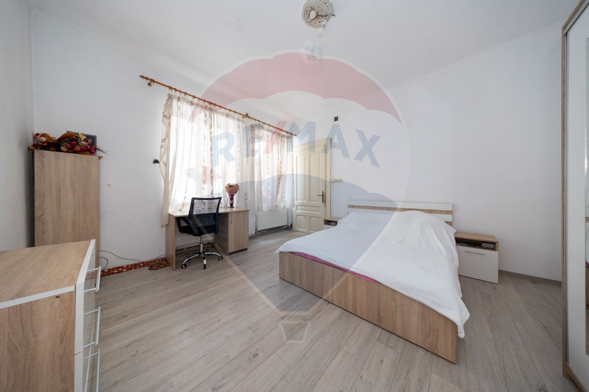 Apartamentul dispune de o compartimentare decomandata, terasa, 2 intrari separate din terasa, bucatarie,camara, pod mansardabil pe toata suprafata apartamentului, baie, beci spatios, doua dormitoare, sufragerie de 36 mp.=, centrala pe gaz.