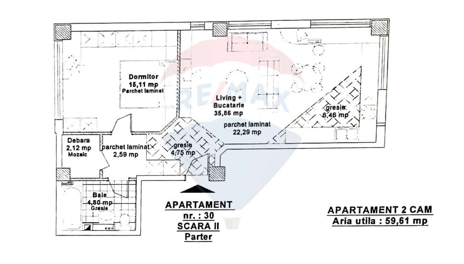 Spațiul: 59.6 mp utili și lumină de Vest