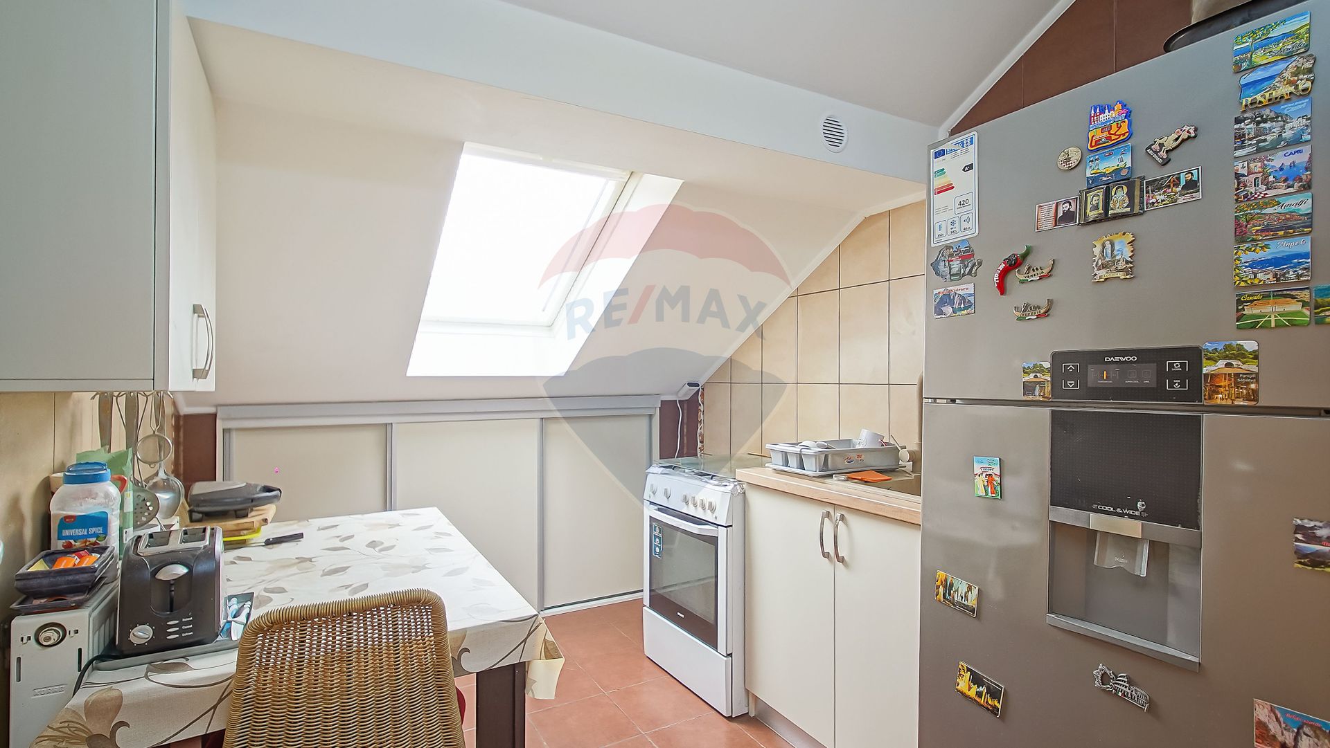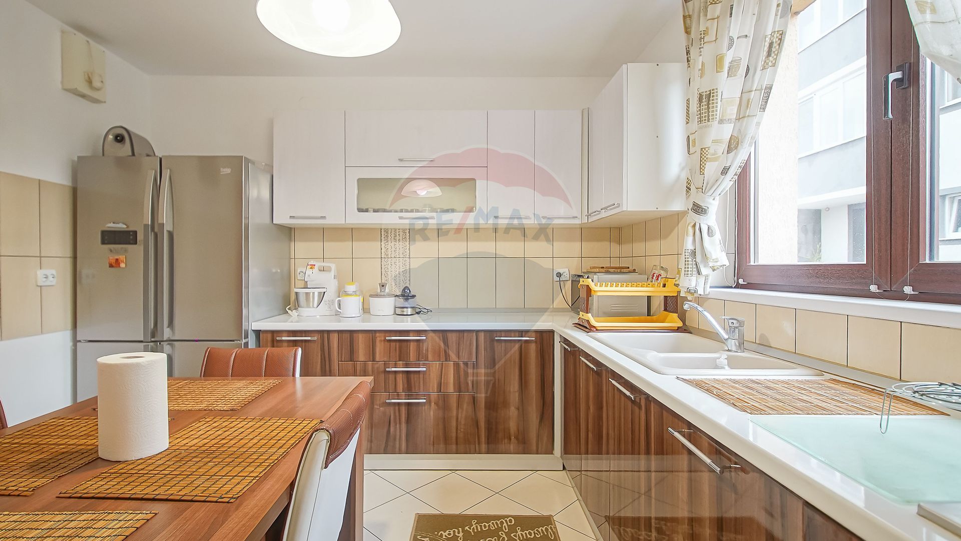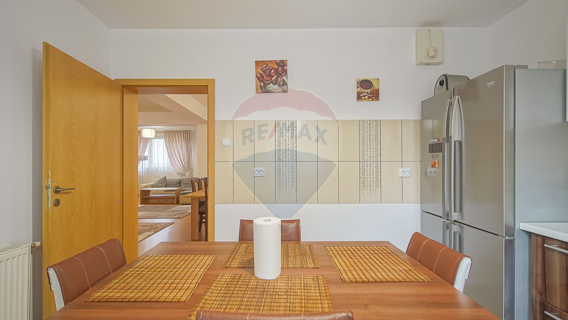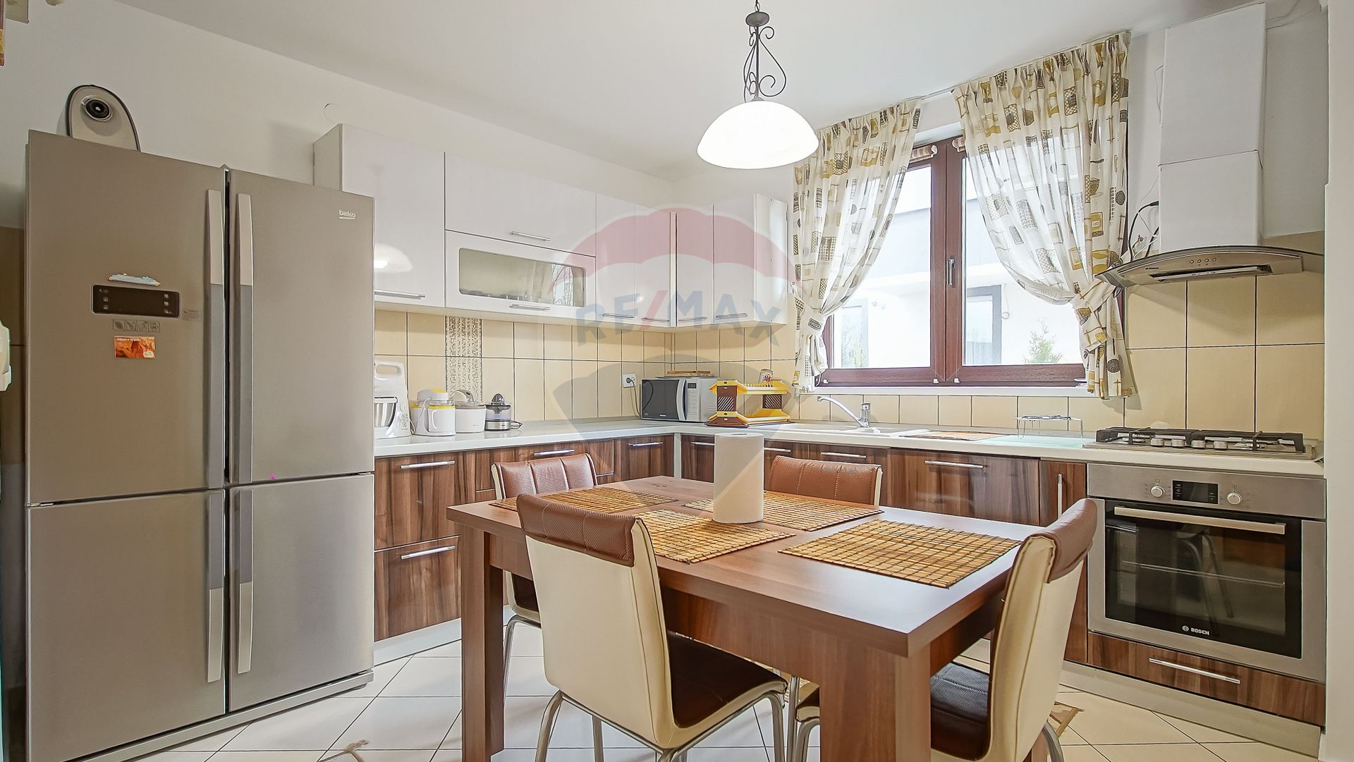 - Bucătărie amenajată cu bun gust, complet mobilată și utilată, dotată cu frigider dublu, zonă de luat masa, mașină de spălat vase și electrocasnice