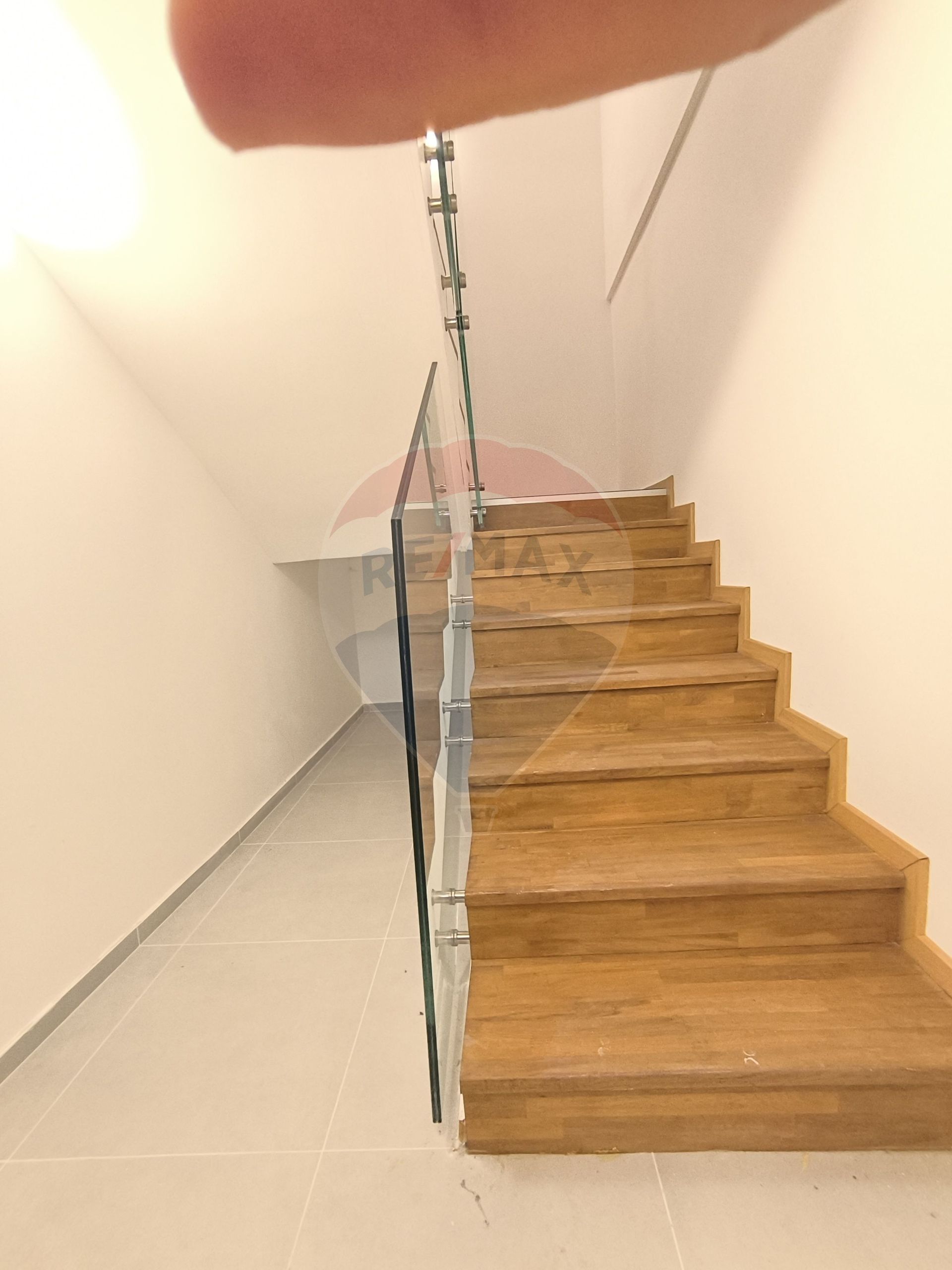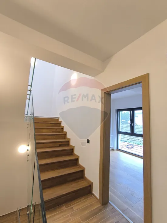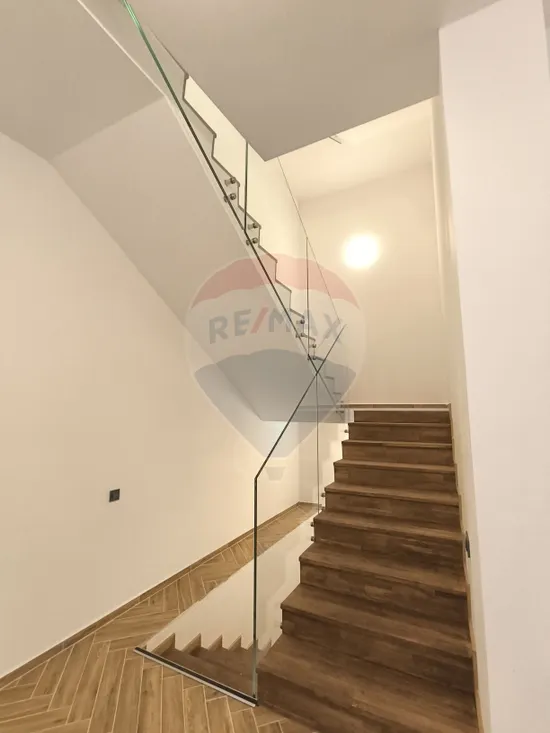 Gresie specială pentru pardoseli încălzite, scări din lemn masiv și balustrade din sticlă securizată;