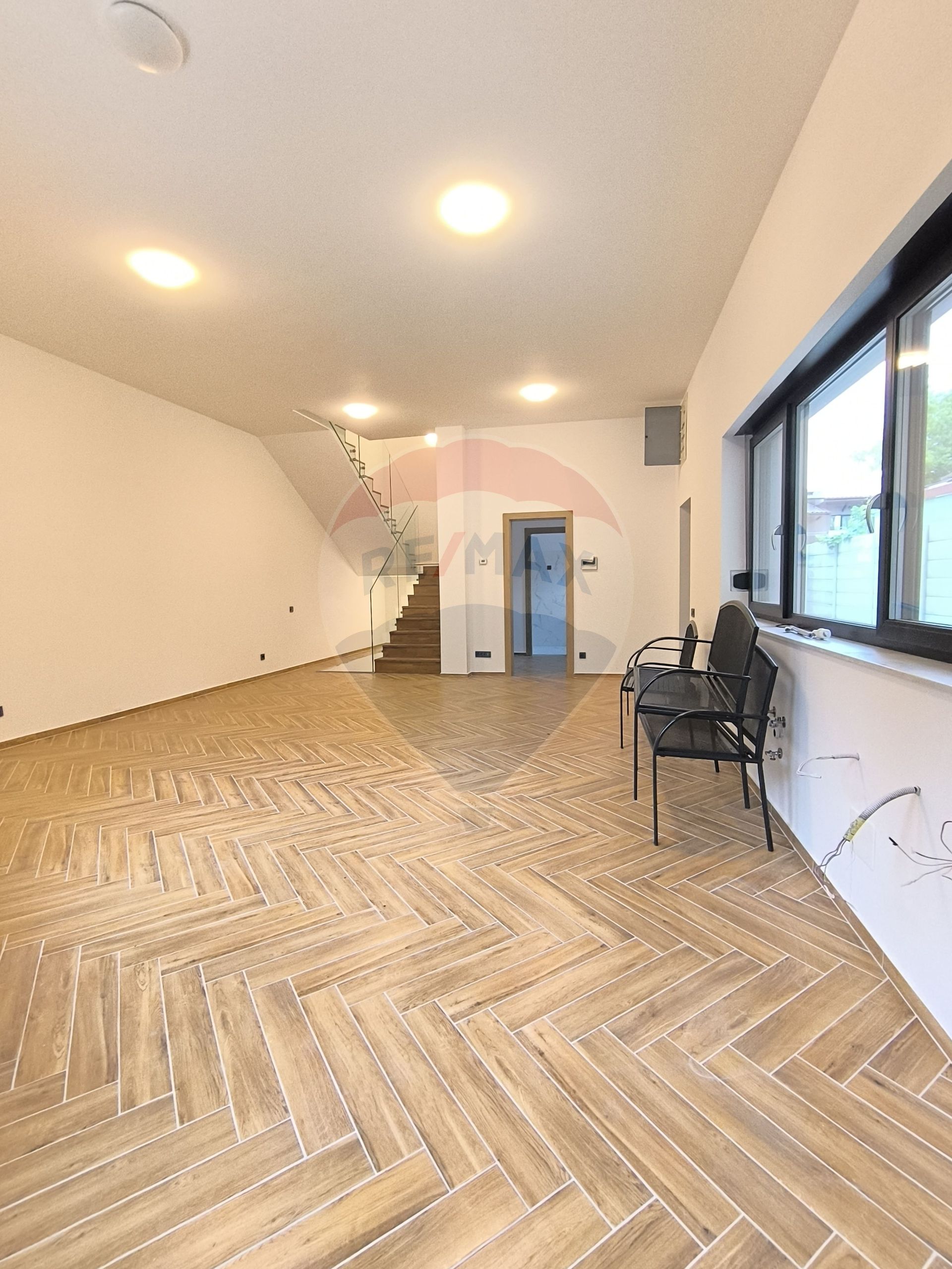 Lumina naturală pătrunde generos prin ferestrele ample, evidențiind spațiile deschise și armonios compartimentate.