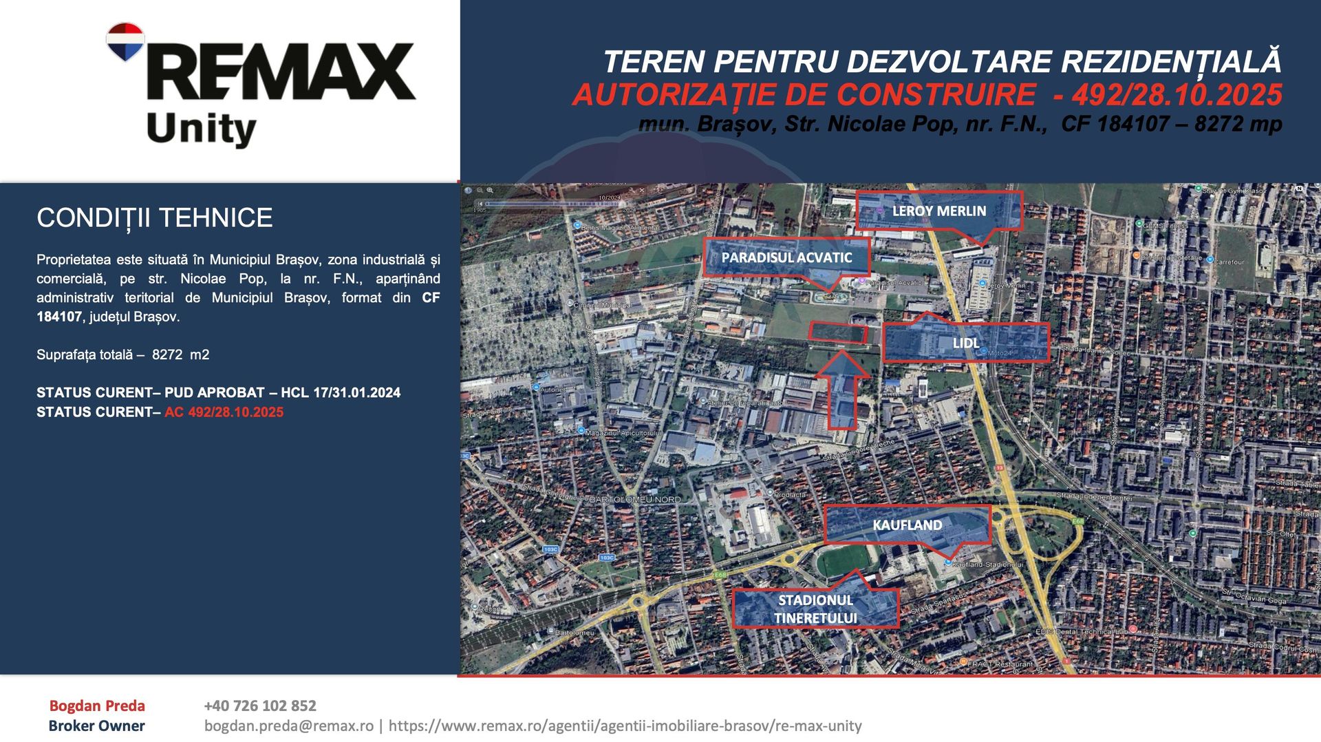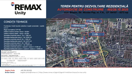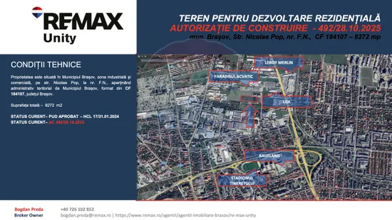 Oportunitate rară pentru dezvoltatori imobiliari: teren intravilan de 8.272 mp în municipiul Brașov, cu PUD aprobat și Autorizație de Construire pentru ansamblu rezidențial cu funcțiuni mixte. În prezent, acesta este singurul teren disponibil la vânzare în Brașov cu autorizare pentru blocuri, eliminând ani întregi de proceduri urbanistice și incertitudine administrativă.