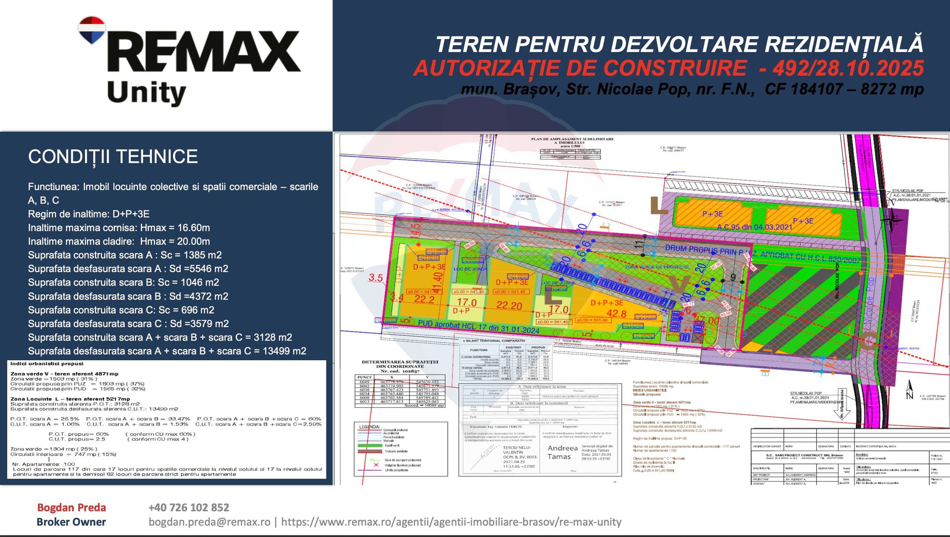 Autorizația permite realizarea unui ansamblu rezidențial modern cu funcțiuni comerciale la parter, ceea ce oferă flexibilitate pentru vânzare, închiriere sau dezvoltare mixtă. Documentația urbanistică PUD este aprobată prin HCL 17/31.01.2024.