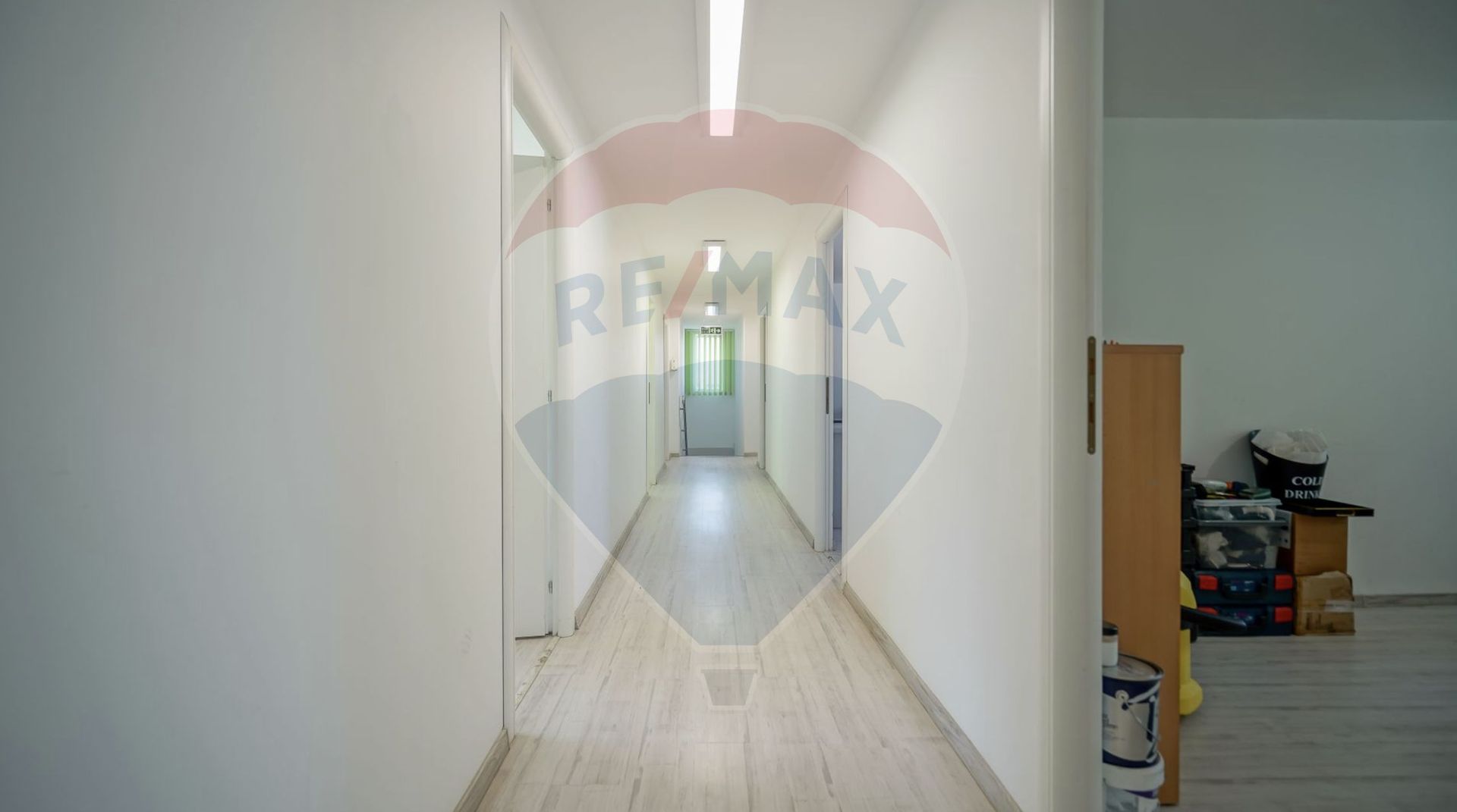 La parter, spațiul este organizat sub formă de open space luminos, cu suprafețe vitrate generoase, completat de o bucătărie, un atelier și o cameră de depozitare, beneficiind de încălzire în pardoseală și o înălțime utilă de 3,2 metri. Etajul este compartimentat în birouri și dispune de două grupuri sanitare separate, fiind potrivit pentru activități administrative sau de management.