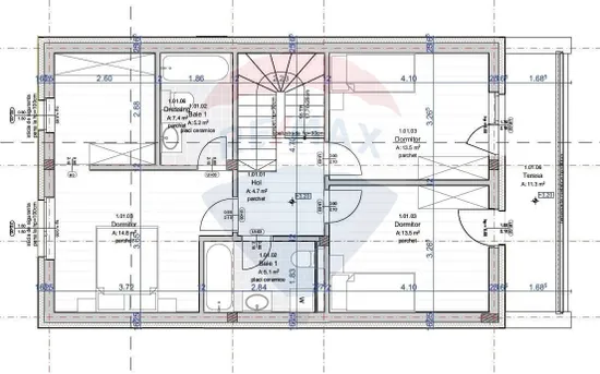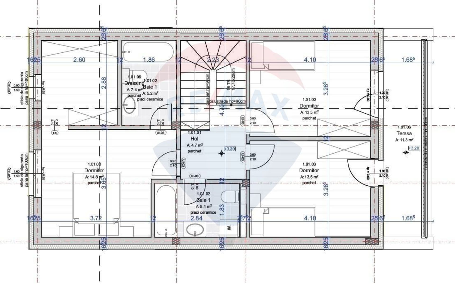 -etaj: dormitor matrimonial cu baie proprie și dressing, două dormitoare, baie, terasă