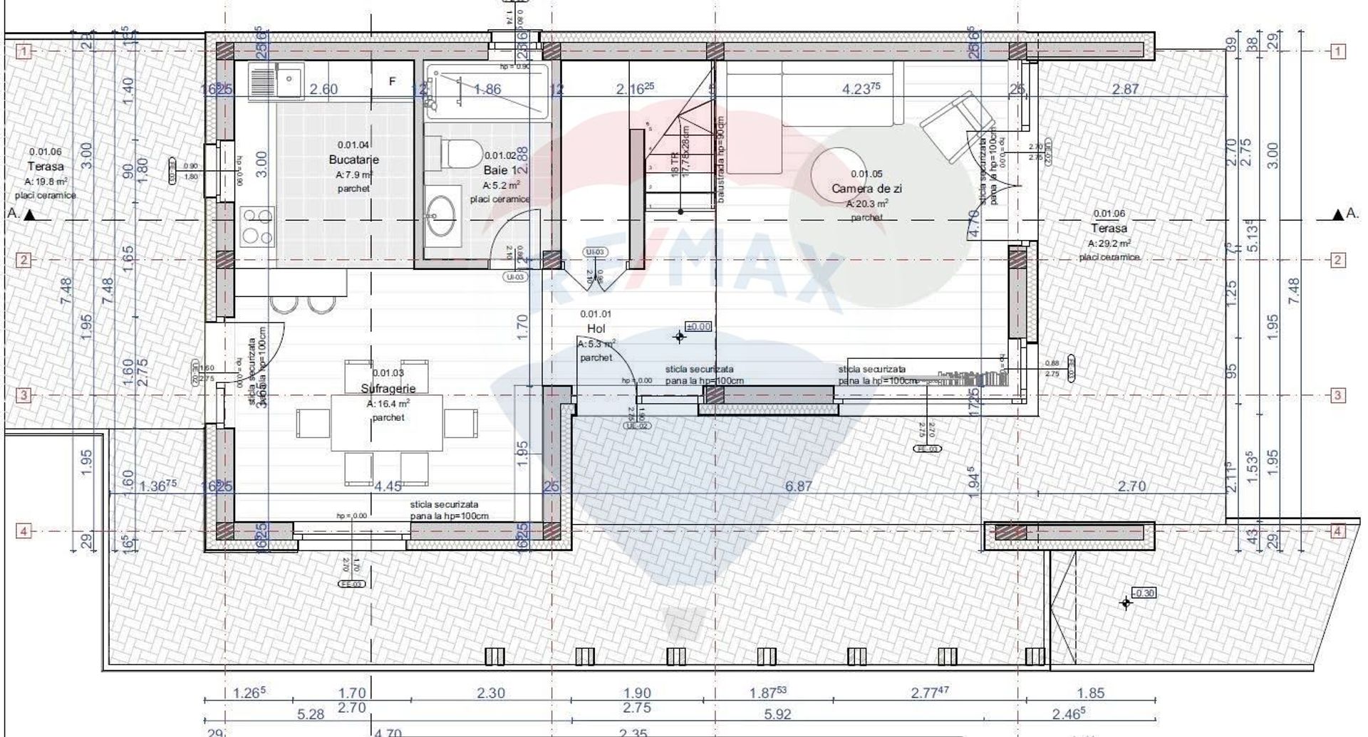 -parter: living, bucătărie, baie, terasă