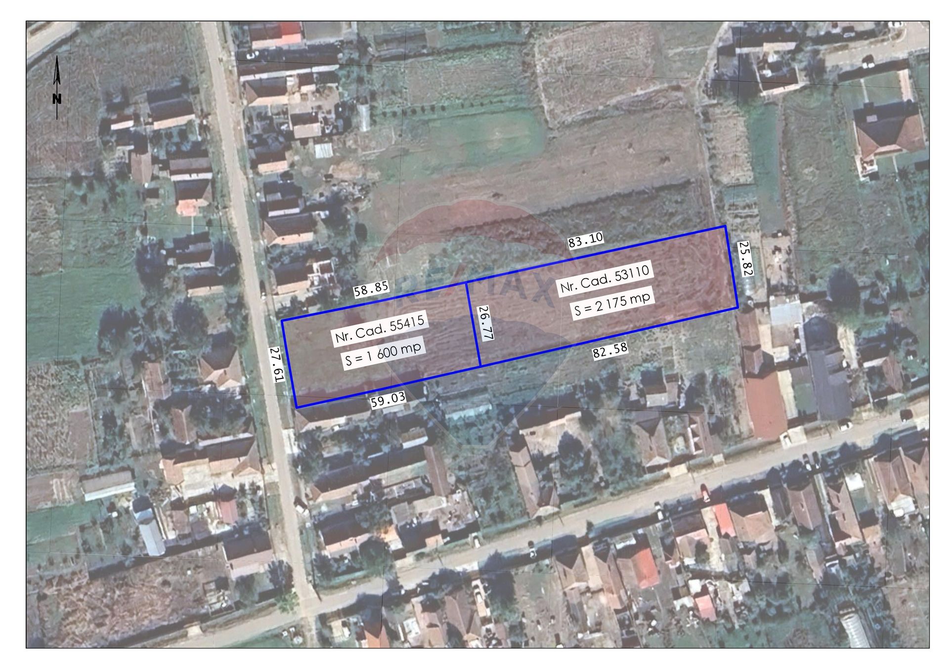 Prima parcelă, de 1,600 mp, situată lângă drumul de acces, cu front stradal de 27.61 ml, este delimitată cu un gard, cu fundație, și împrejmuită cu gard de sârmă. A doua parcelă, din spate, cu o suprafață de 2,175 mp, poate fi folosită ca grădină sau livadă de pomi.