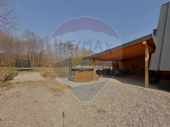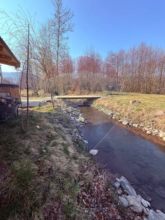 În exterior, proprietatea se transformă într-un adevărat colț de relaxare: ciubărul te invită la momente de răsfăț indiferent de anotimp, zona de grill este perfectă pentru mese în aer liber, iar spațiul de joacă – dotat cu trambulină și leagăn – aduce bucurie celor mici. Un element cu totul special este pârâul care traversează proprietatea de două ori, oferind un farmec aparte și posibilitatea de a te relaxa admirând peștii sau ascultând susurul apei.