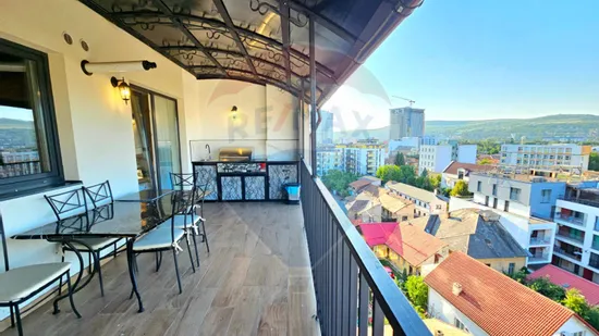 Intri si spatiul respira. Livingul cu semineu e locul unde seara de vineri are tot ce ii trebuie, atmosfera, spatiu, confort. Terasa amenajata cu gratar, chiuveta si aragaz e o a doua camera de zi pe care o folosesti 9 luni din an. Cum arata o seara de vara acolo, la etajul 7, cu Clujul aprins sub tine?