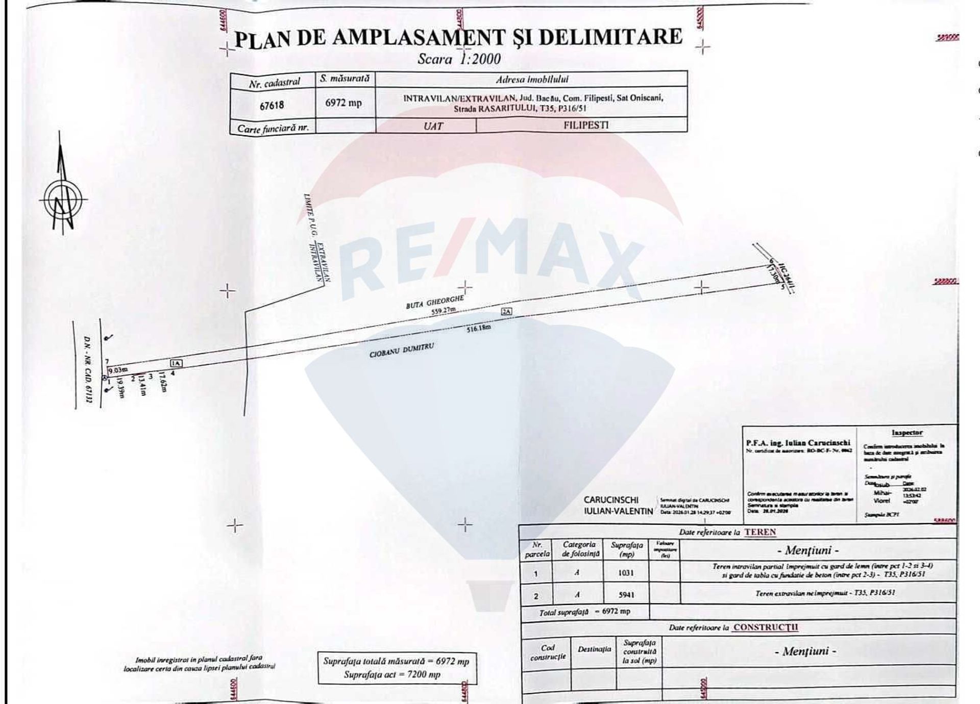 Vă propun spre vânzare un teren in sat. Oniscani, com Filipesti, strada Răsăritului, cu suprafața totală de 6.972 mp, din care intravilan 1031mp și o parte extravilan 5941mp, avand deschidere directă la drumul național.
