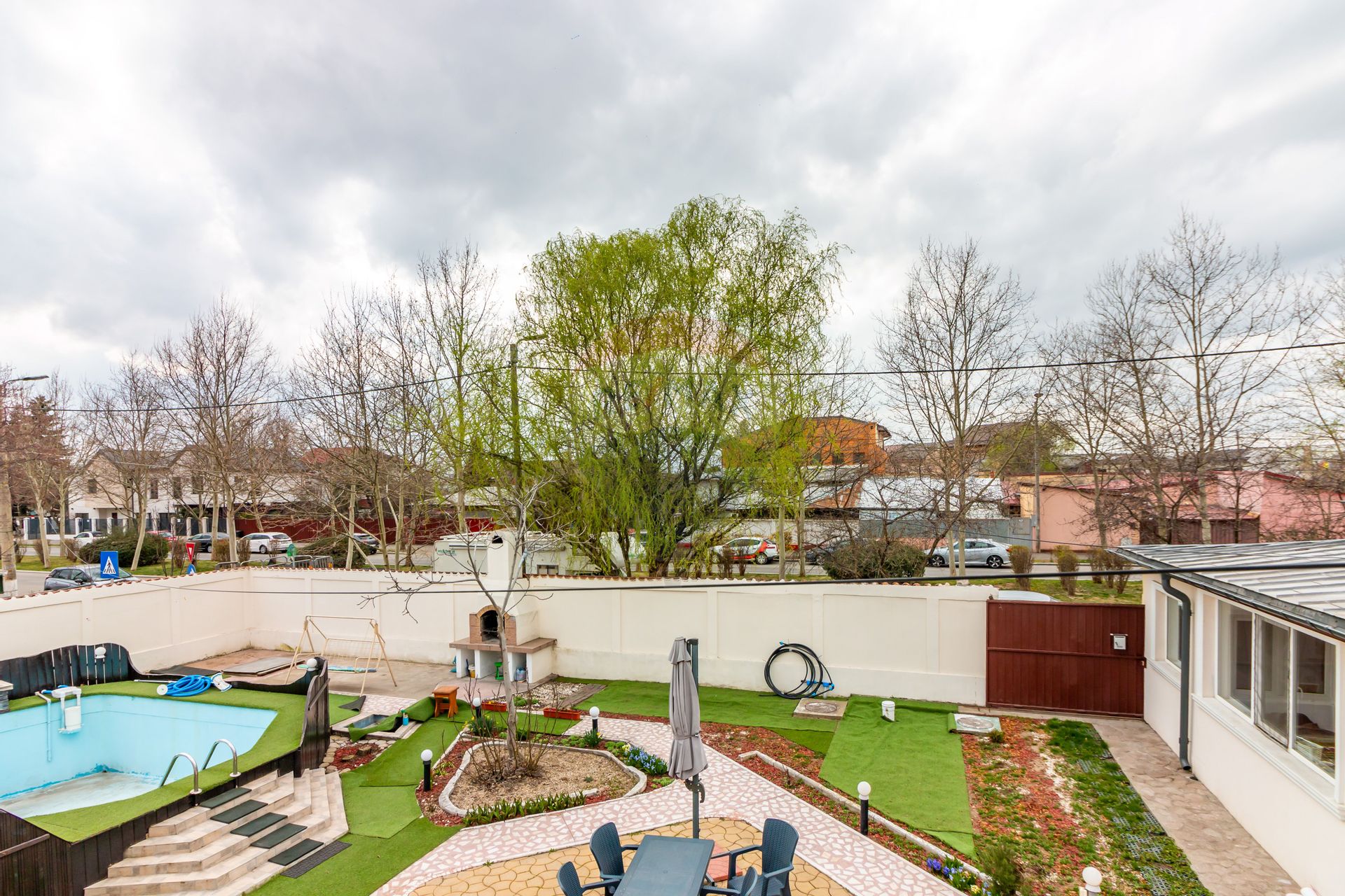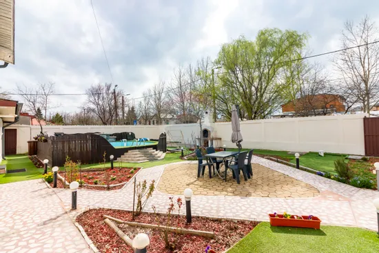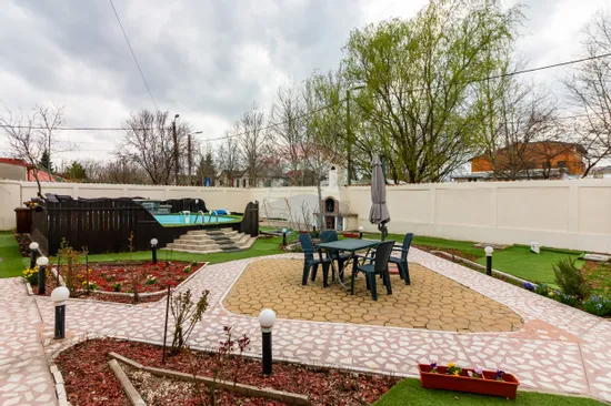 Curtea este amenajată și include piscină și zonă de grătar, oferind un spațiu ideal pentru relaxare sau pentru desfășurarea unor activități de tip business.