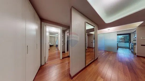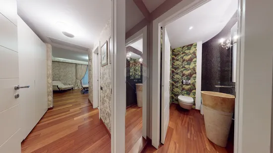 Apartamentul de 170 mp este foarte bine impartit, dormitorul matrimonial cu baie proprie fiind separat de restul camerelor, oferind intimitate tuturor membrilor familiei. Mobilierul si finisajele interioare sunt de cea mai buna calitate, aici intalnind cele mai bune marci din lume precum Exenta, Porro si Ralph Lauren. Bucataria de asemenea este utilata de marele brand Miele, incorporata de mobilier de lux marca Gatto.