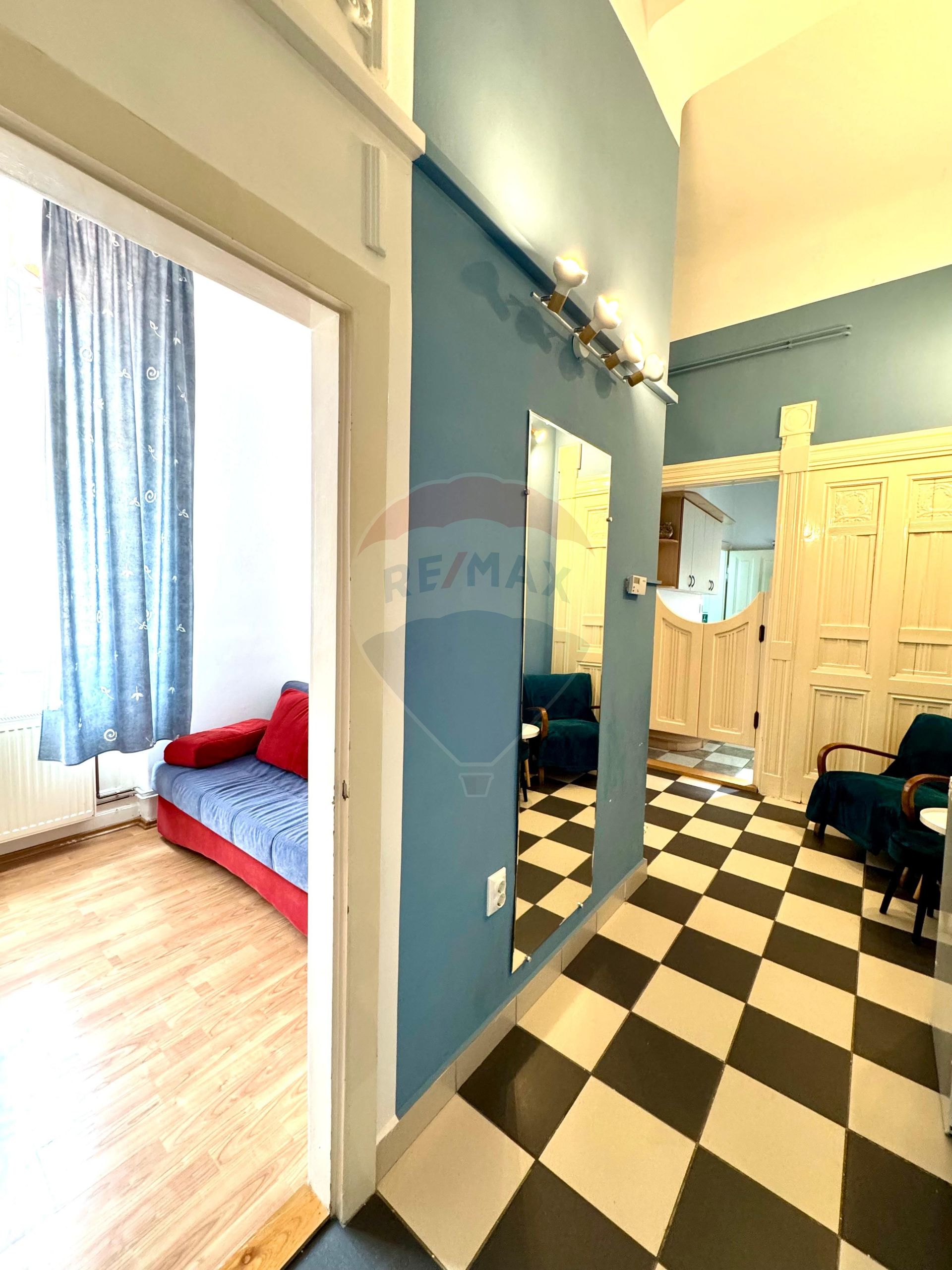 Interiorul apartamentului se remarcă prin: spații luminoase, finisaje elegante, în tonuri calde și rafinate, pardoseală tip șah alb-negru, ce oferă un aer boem și sofisticat, tâmplărie și uși interioare originale, restaurate cu grijă