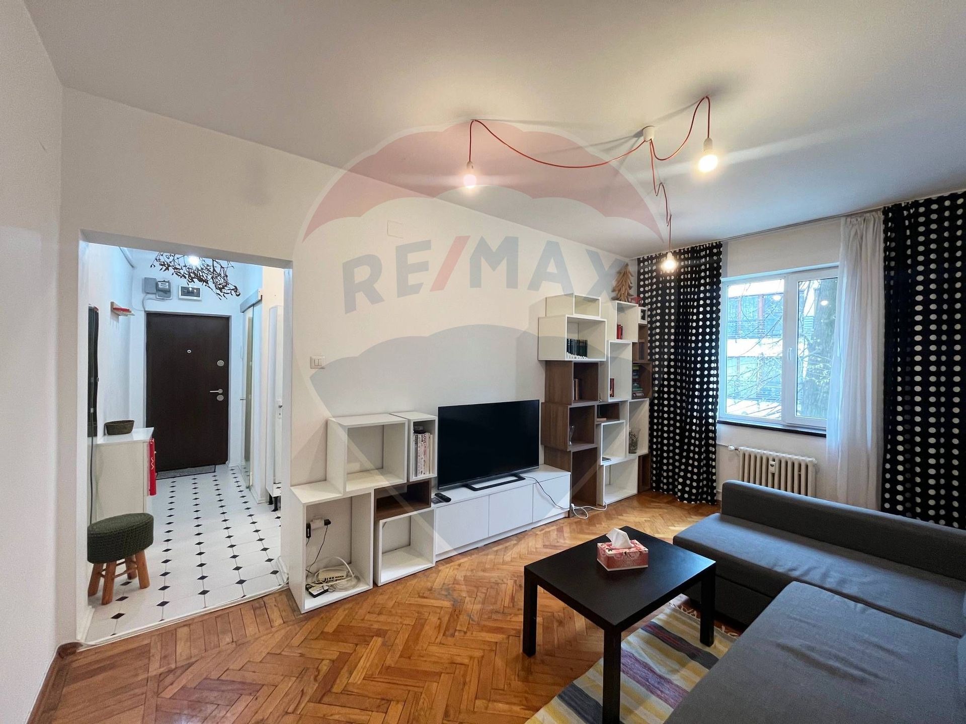 - Living cu fereastra catre zona linistita din spatele blocului, orientare vest. Canapea extensibila, televizor